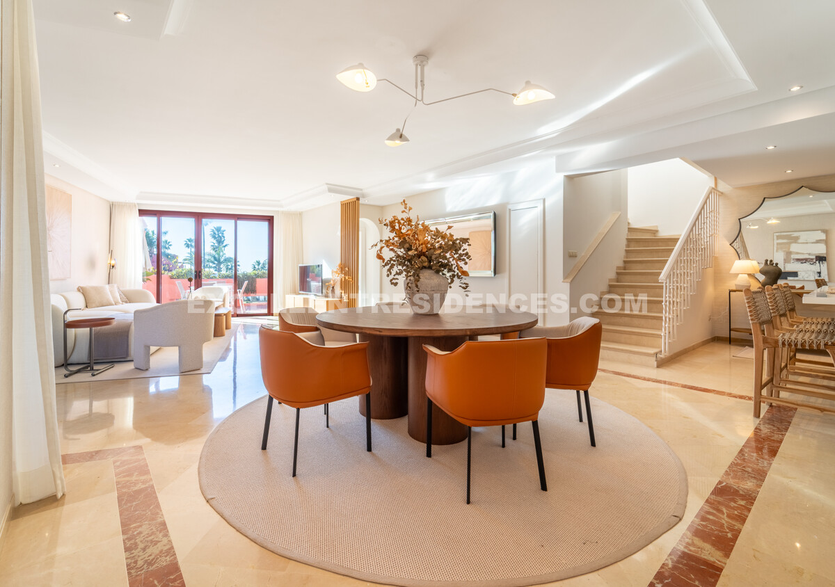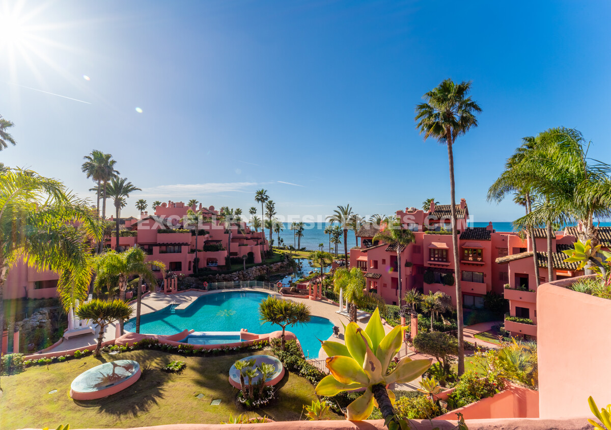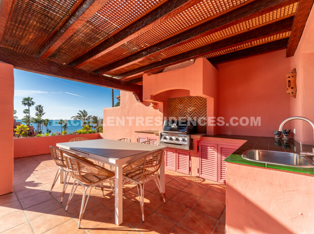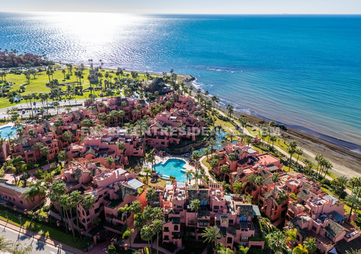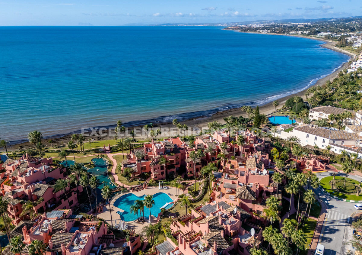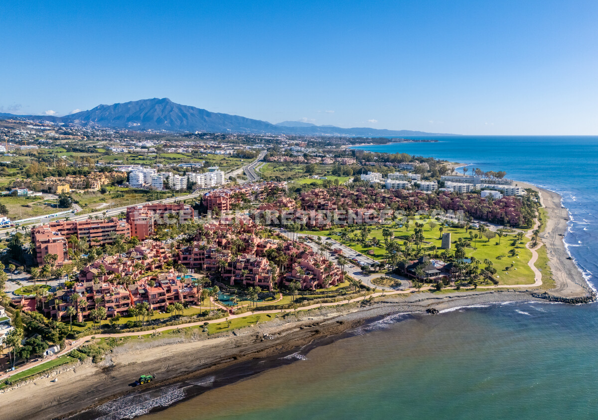 Set on the frontline of the beach in the prestigious Cabo Bermejo community, this exclusive duplex penthouse enjoys sweeping Mediterranean views that stretch to Gibraltar. Positioned in the heart of Estepona’s New Golden Mile, it offers an established coastal setting with direct access to the promenade and sand.