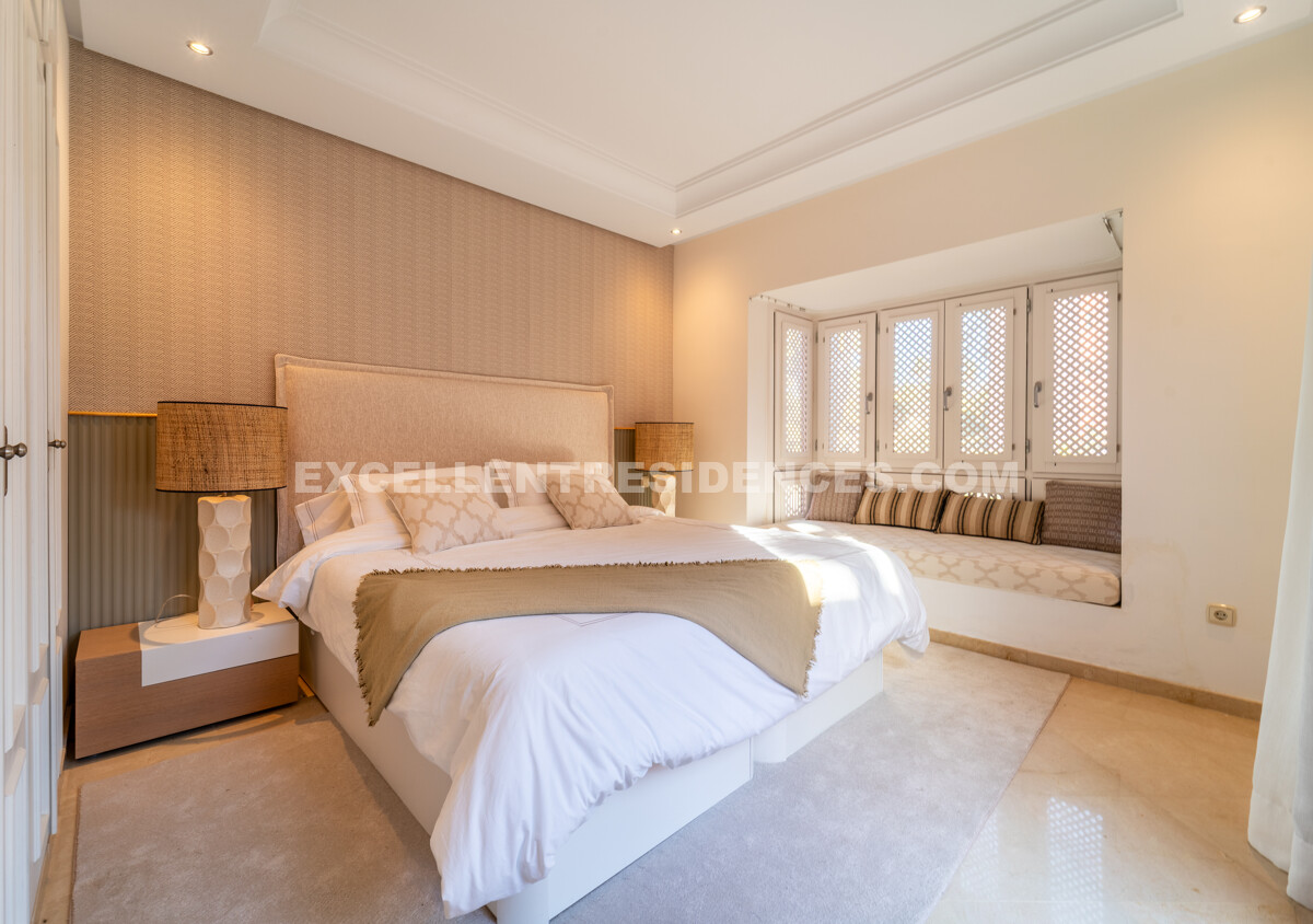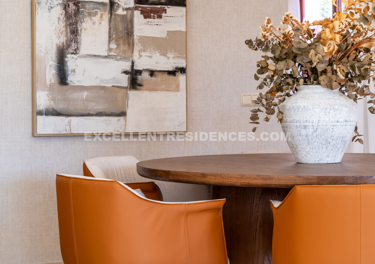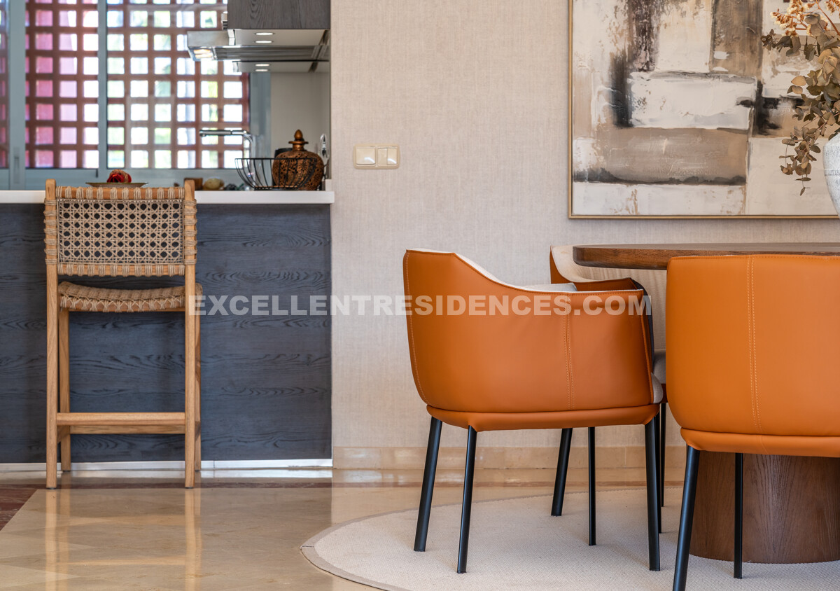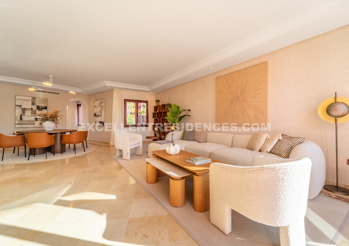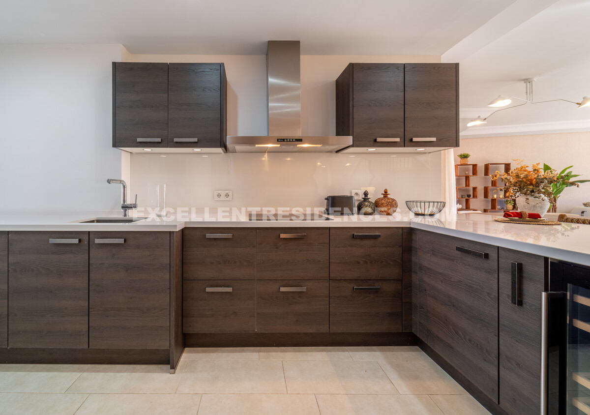 Arranged across two floors, the home is crafted for space, light, and comfort. The main level opens with an elegant hall leading to an open-plan living and dining area connected to a renovated American-style kitchen with premium appliances and a central island. Large doors extend the living space onto a generous sea-facing terrace—ideal for morning coffee, entertaining, or sunset evenings.