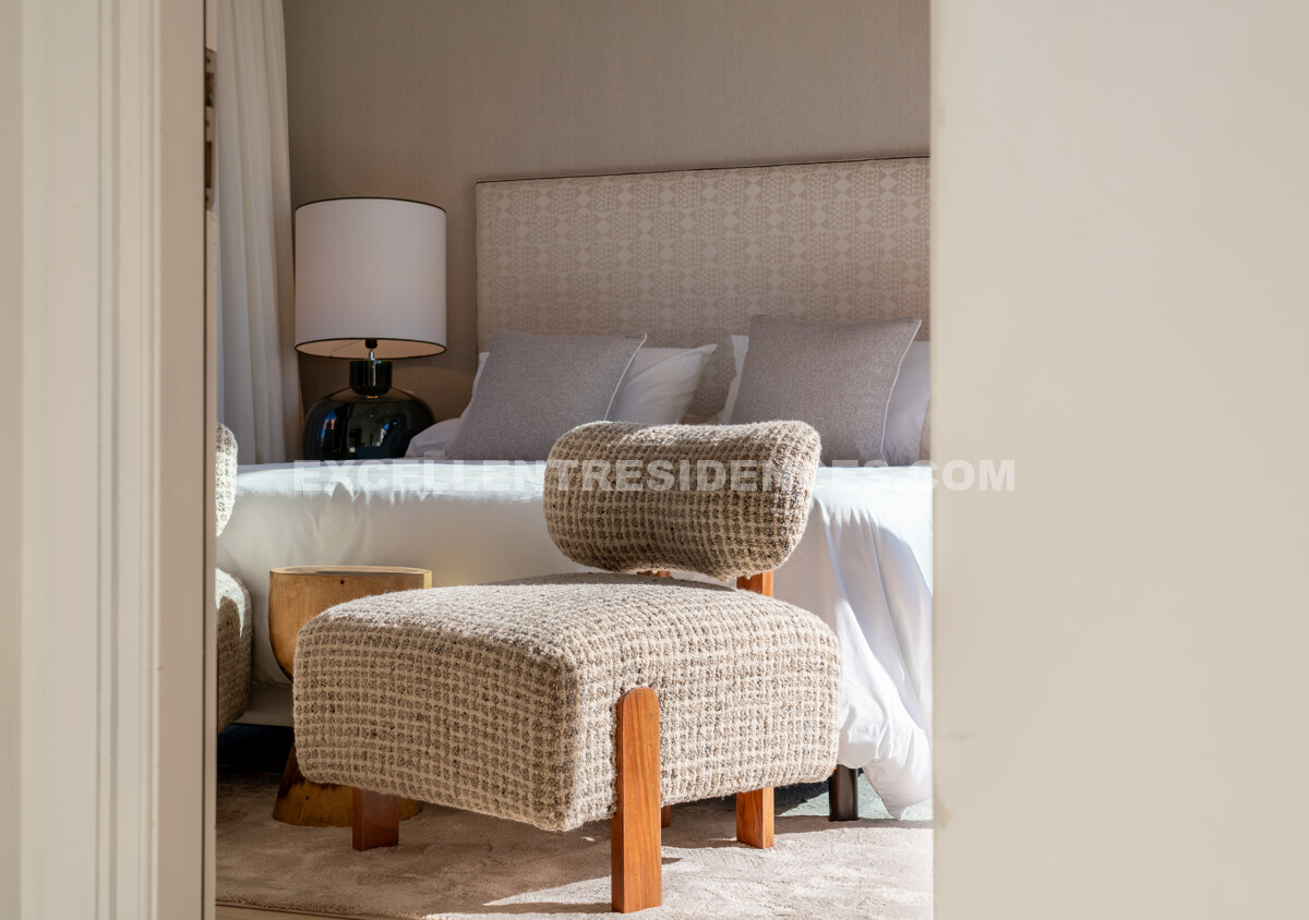 Two well-proportioned bedrooms sit on the main floor, including one with en-suite bathroom, walk-in wardrobe, and terrace access. Upstairs, the vaulted-ceiling master suite creates a true retreat, with an en-suite bathroom, a spacious dressing area, and two terraces—one south-facing with an outdoor kitchen for al fresco dining, and another offering mountain views and flexible use as a wellness or relaxation space.