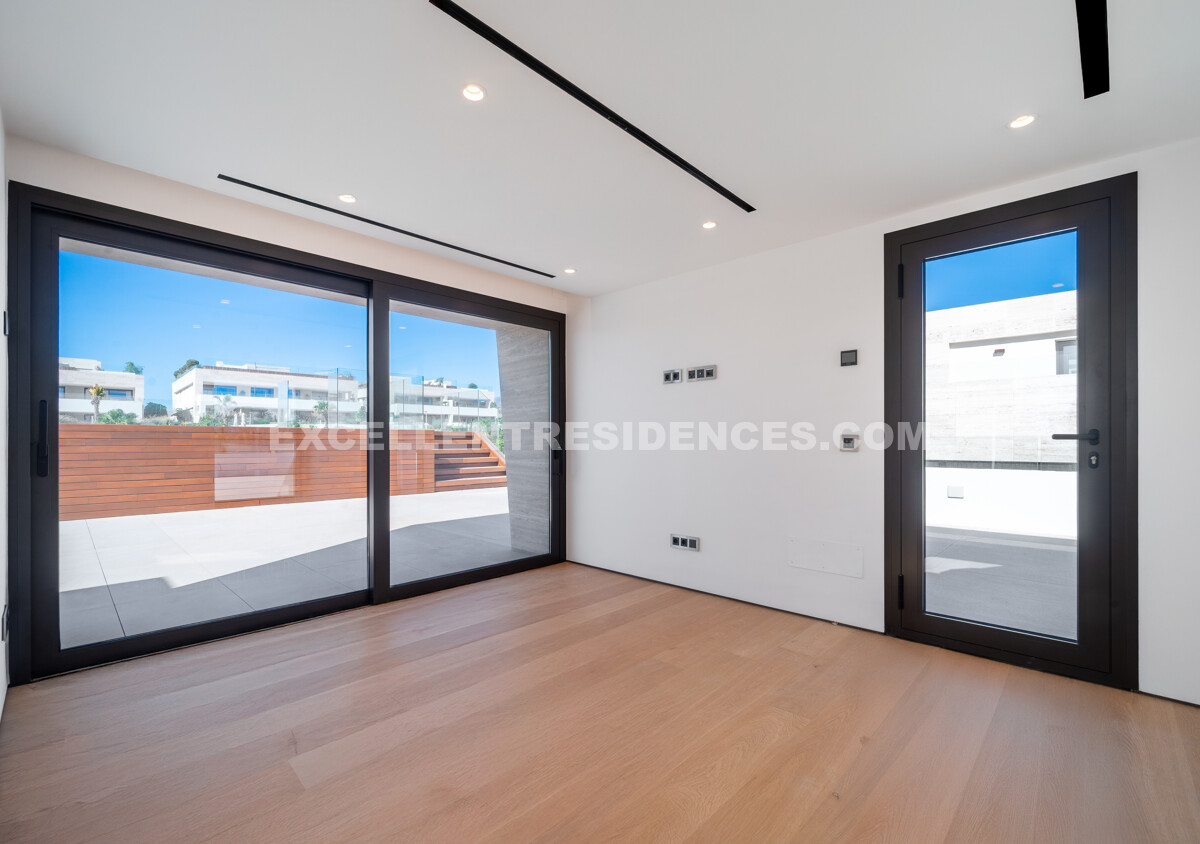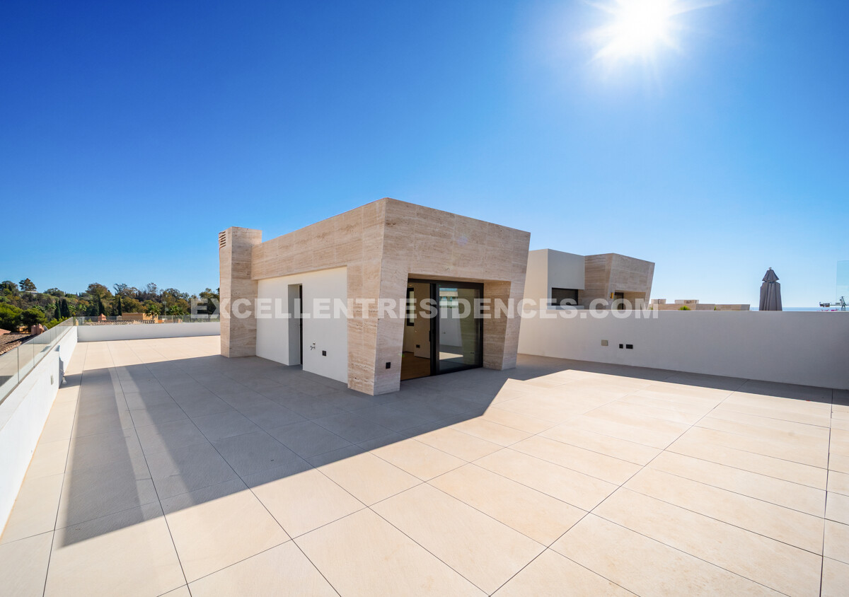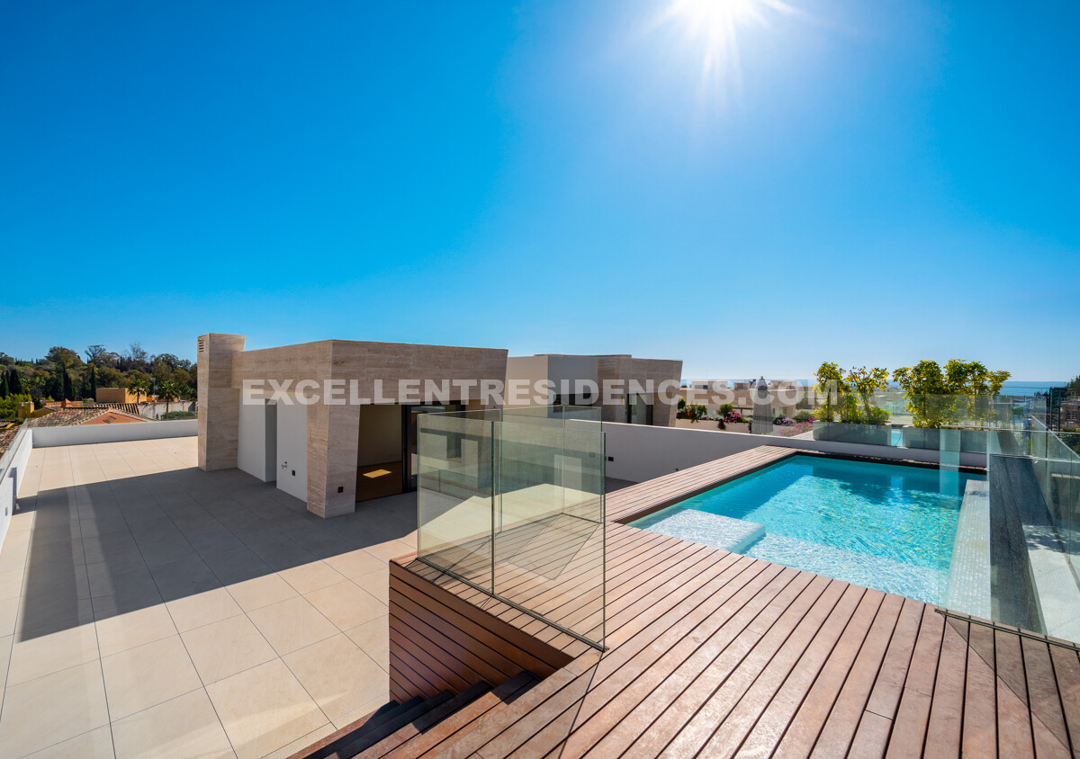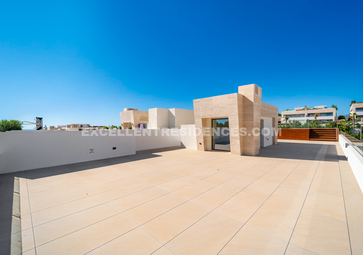 The upper level introduces a versatile additional room that spills onto an expansive private terrace with its own pool and solarium, plus an outdoor kitchen and covered dining area. Sunlit from morning to evening, it frames impressive sea views—perfect for relaxed days and sunset gatherings.