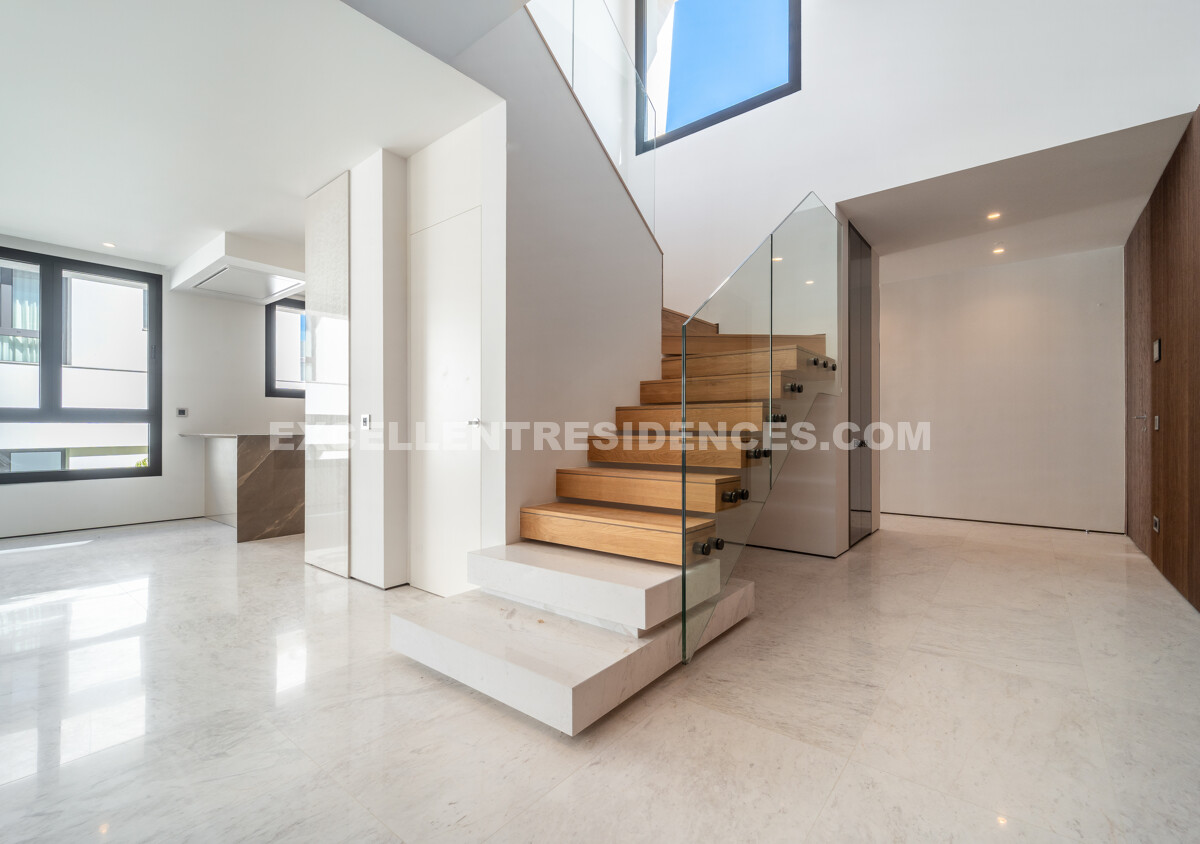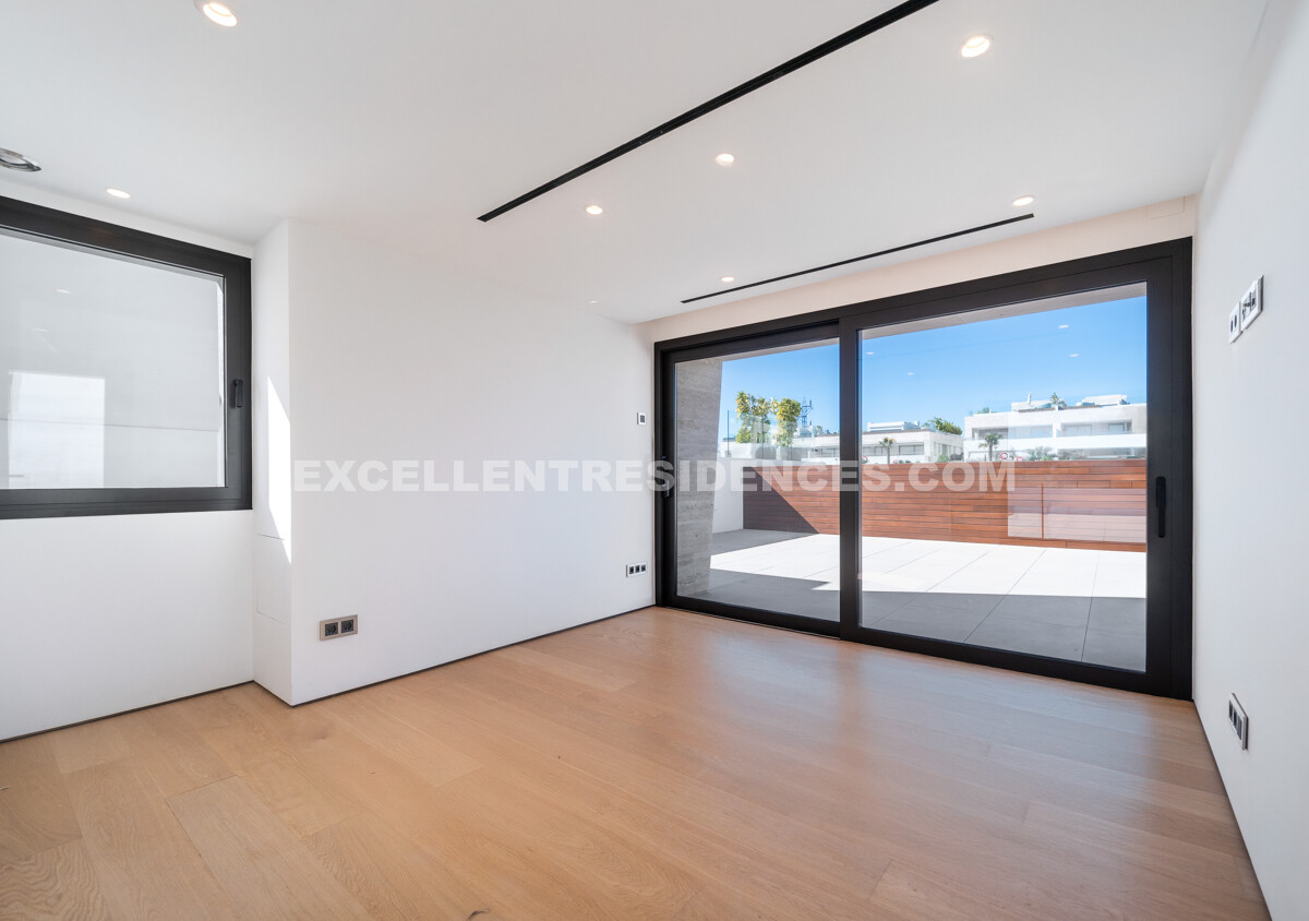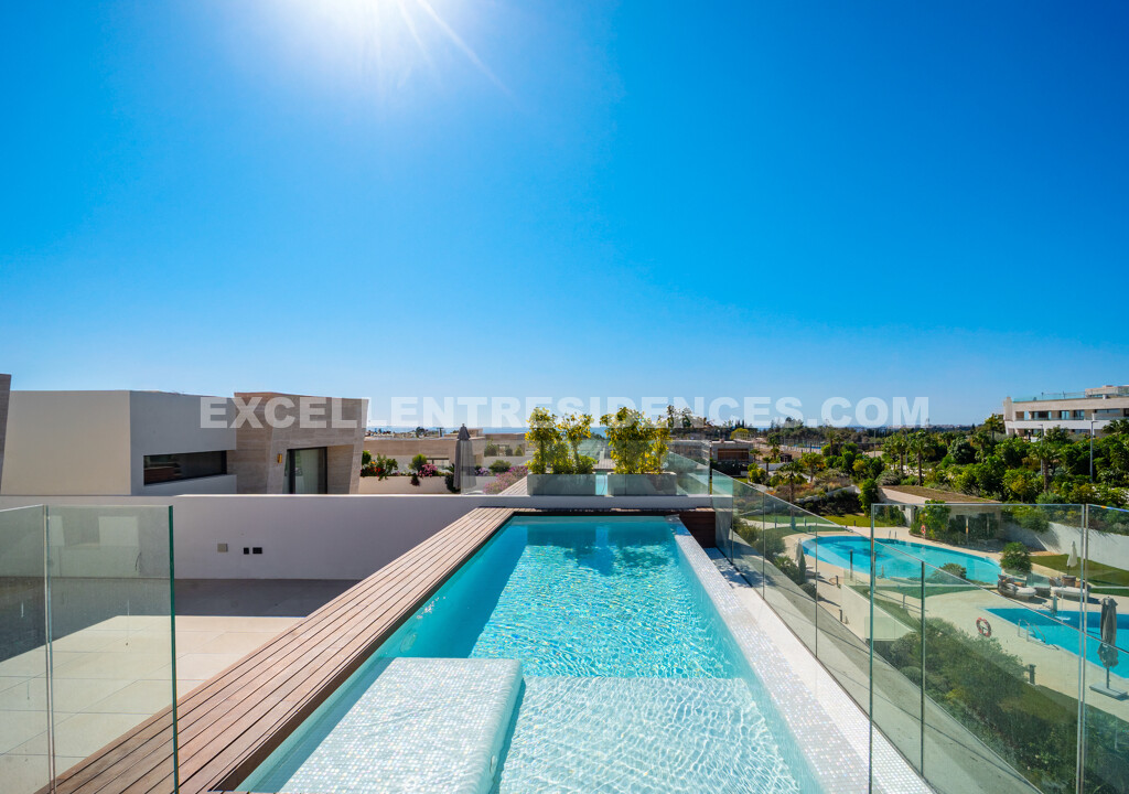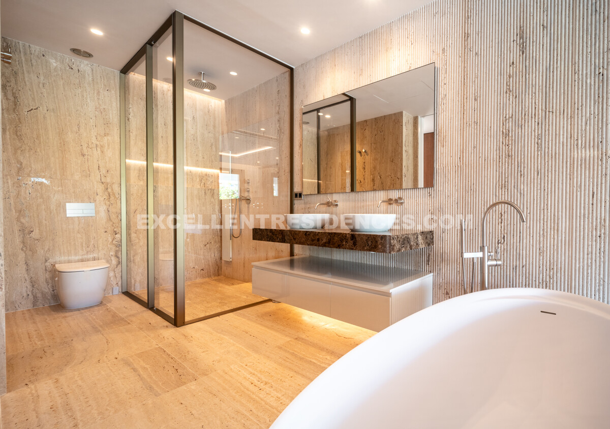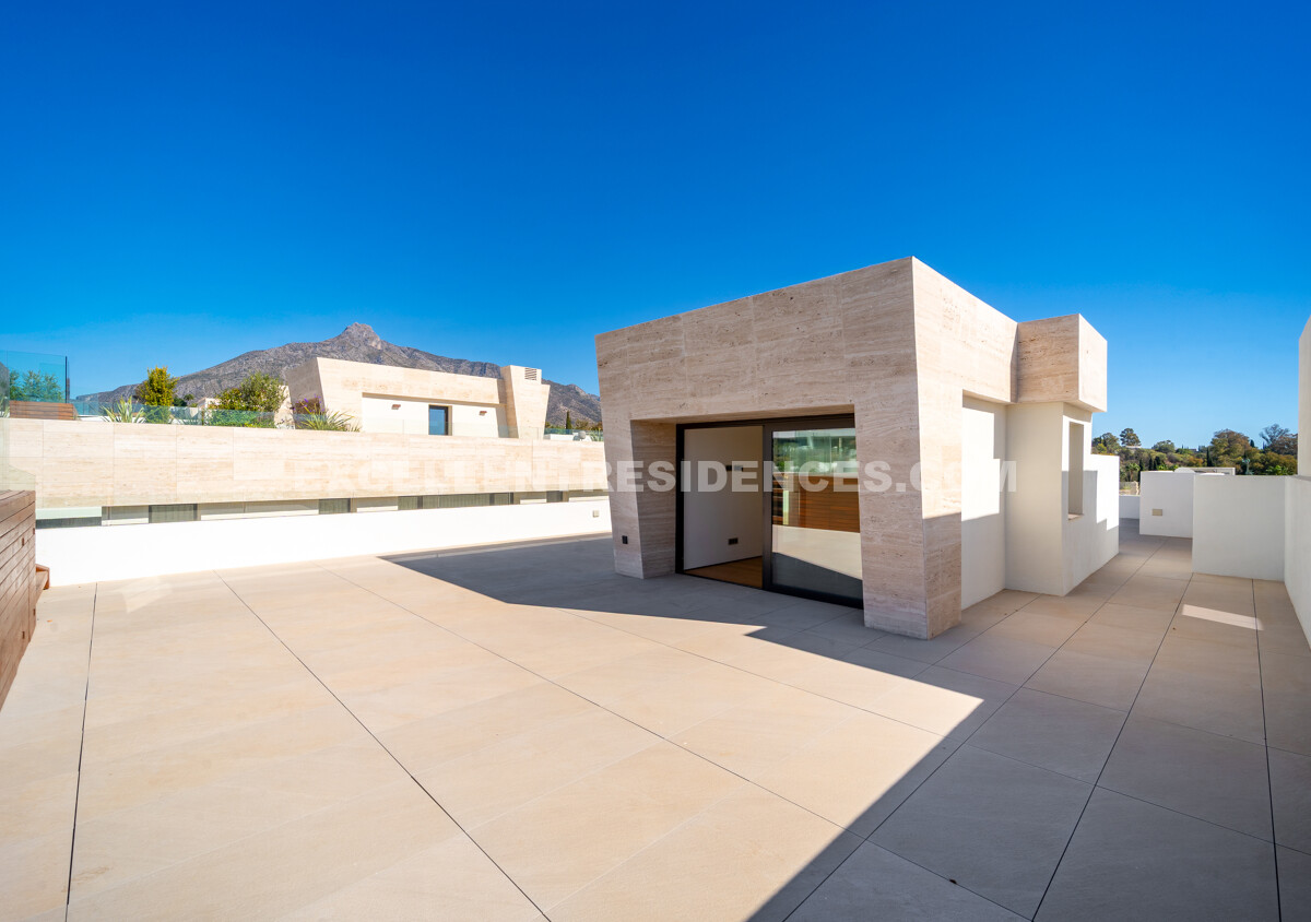 The upper level introduces a versatile additional room that spills onto an expansive private terrace with its own pool and solarium, plus an outdoor kitchen and covered dining area. Sunlit from morning to evening, it frames impressive sea views—perfect for relaxed days and sunset gatherings.