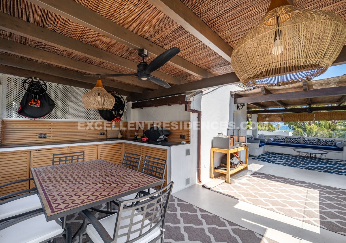 The upper level hosts one of the property’s most impressive features: a 50 m² rooftop terrace with panoramic views of the Mediterranean, landscaped gardens, and pool. It includes a stylish lounge area and a fully equipped outdoor kitchen, complete with ice machine, sink, freezer, and both electric and charcoal barbecues—perfect for social gatherings or peaceful evenings under the stars.