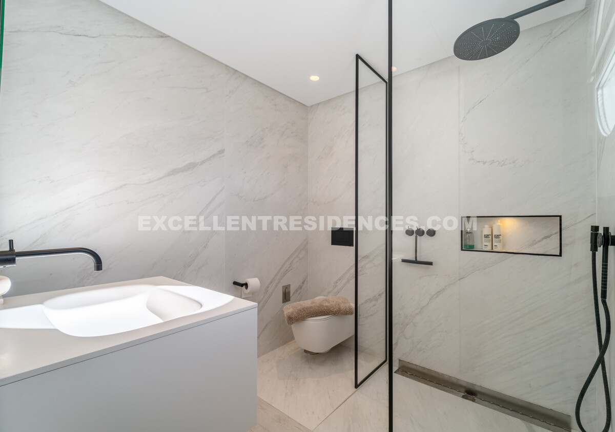 On the entrance level, two bright en-suite bedrooms offer refined comfort; one enjoys its own west-facing terrace for afternoon sun. A thoughtfully designed guest cloakroom and premium bathroom fittings underscore the quality throughout.