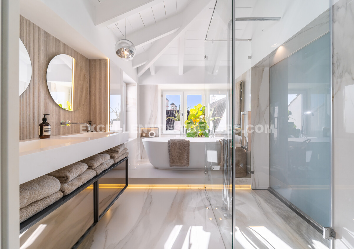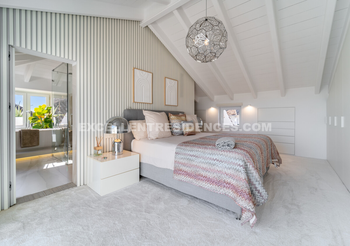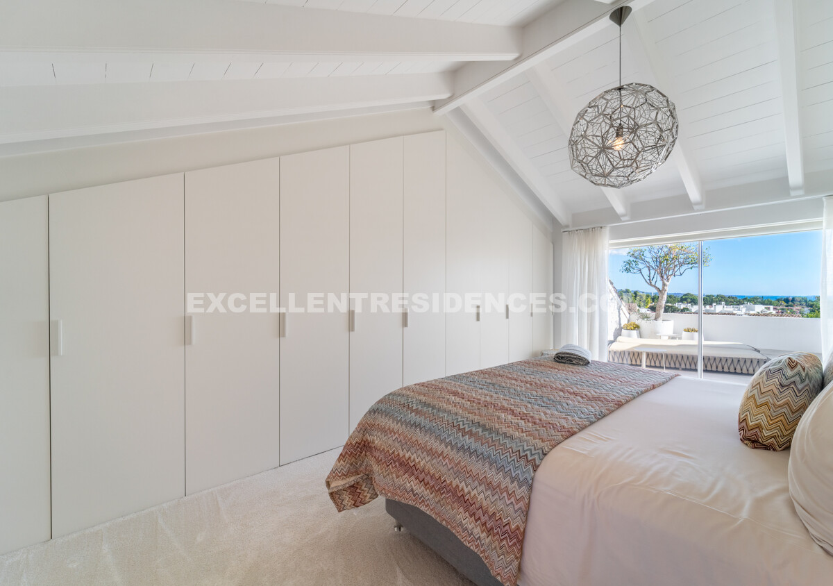 The upper floor is dedicated to an exceptional principal suite beneath vaulted ceilings. A private terrace captures panoramic views of the Mediterranean, Africa, and Gibraltar, while the spacious bathroom—complete with a view-side bathtub—creates a spa-like sanctuary.
