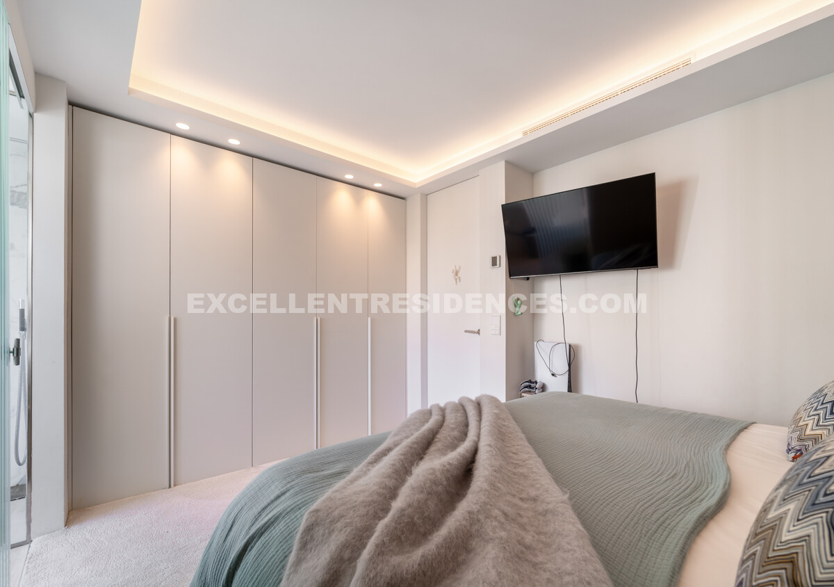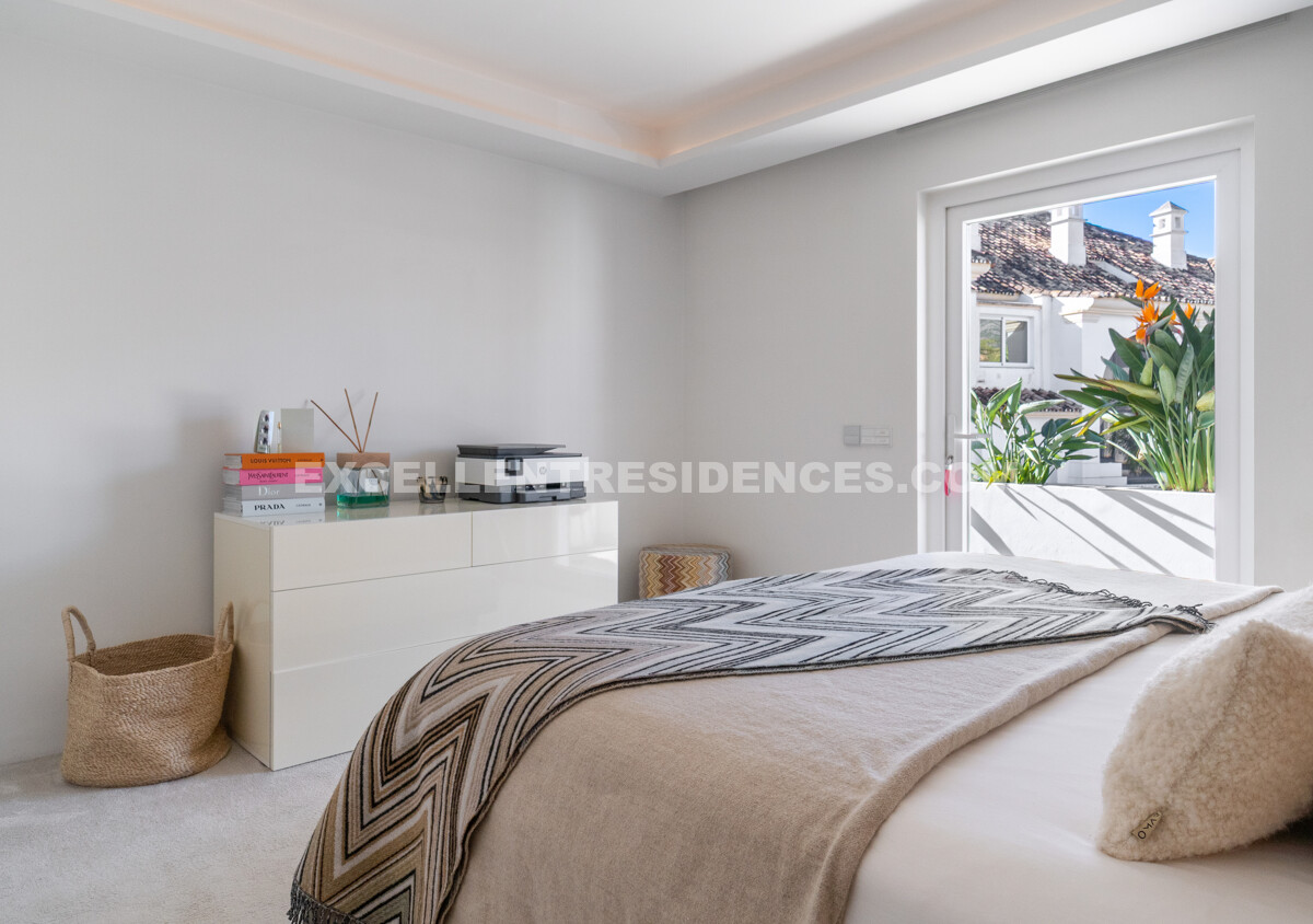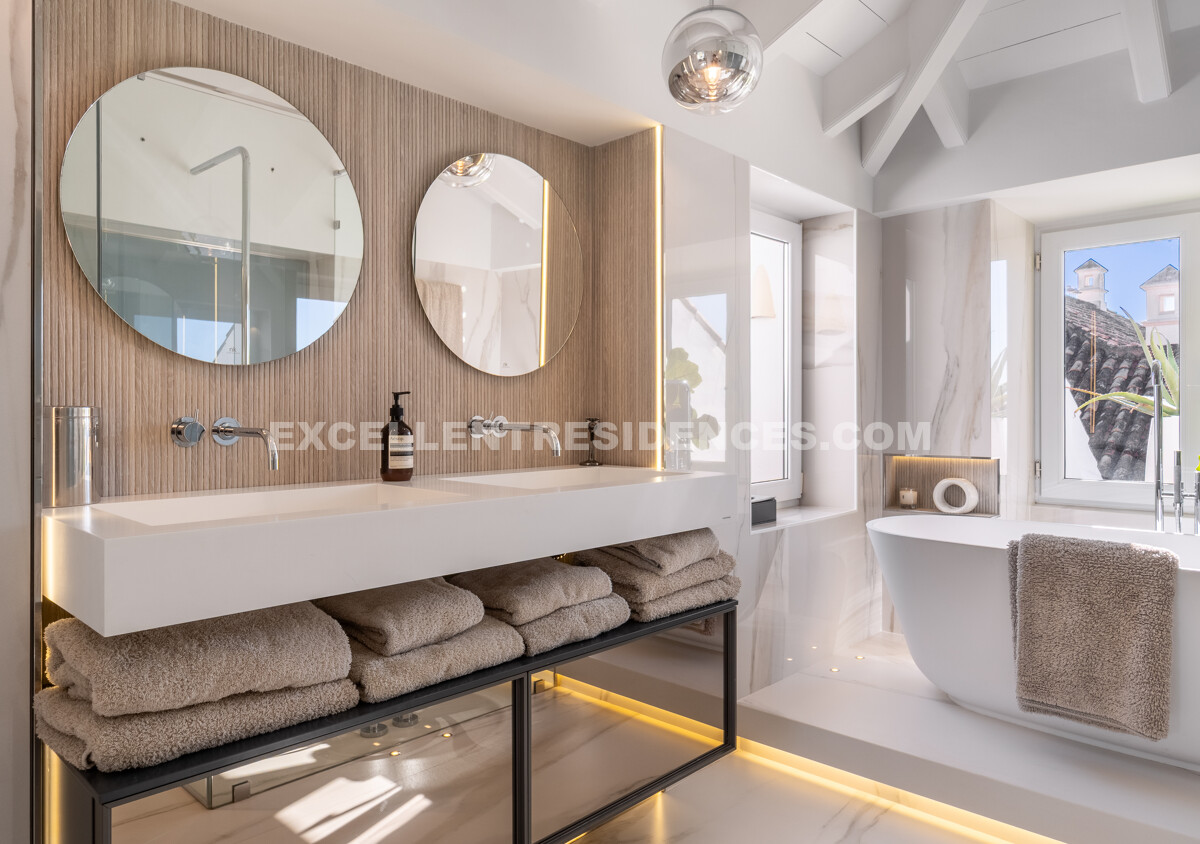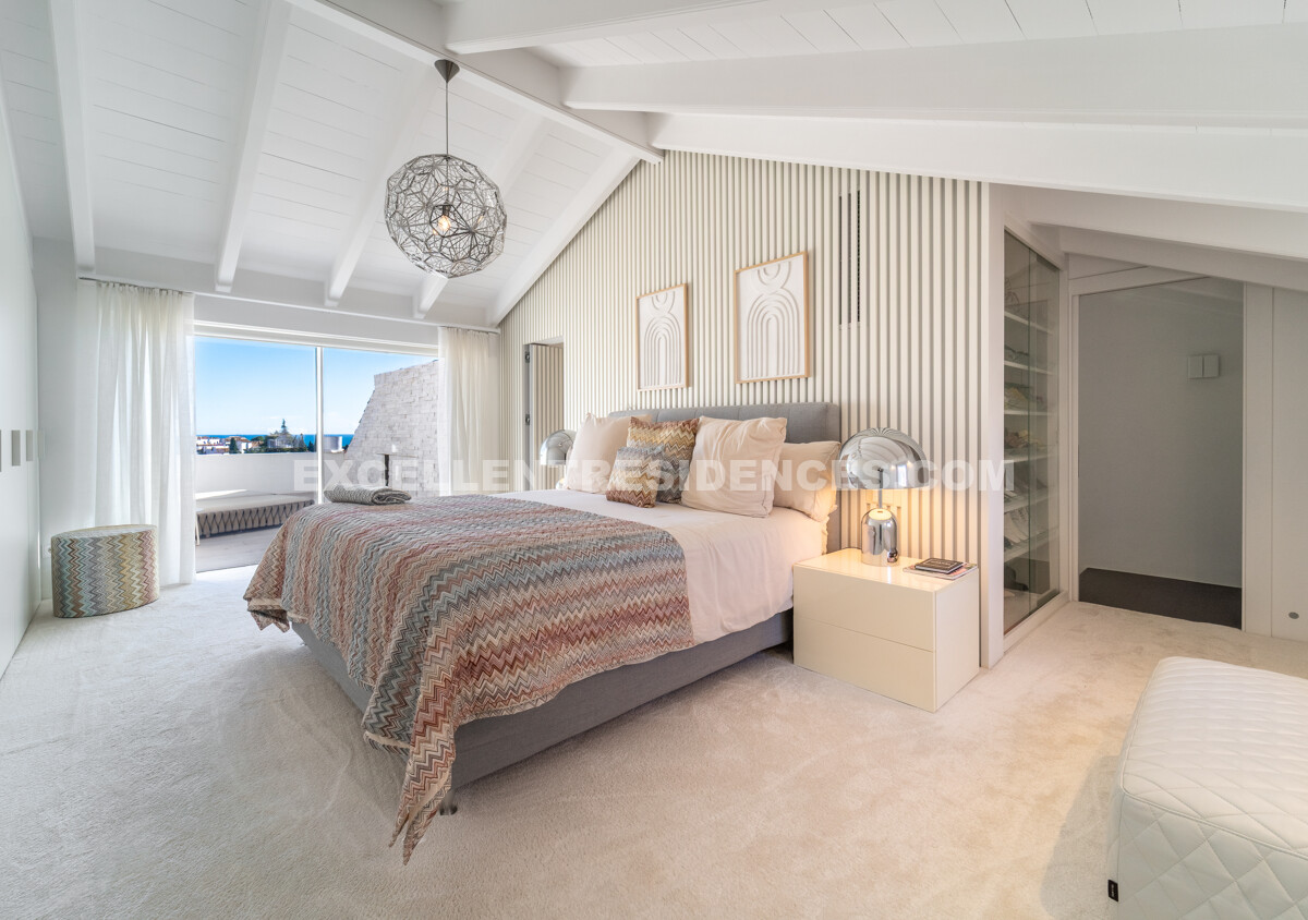 The upper floor is dedicated to an exceptional principal suite beneath vaulted ceilings. A private terrace captures panoramic views of the Mediterranean, Africa, and Gibraltar, while the spacious bathroom—complete with a view-side bathtub—creates a spa-like sanctuary.