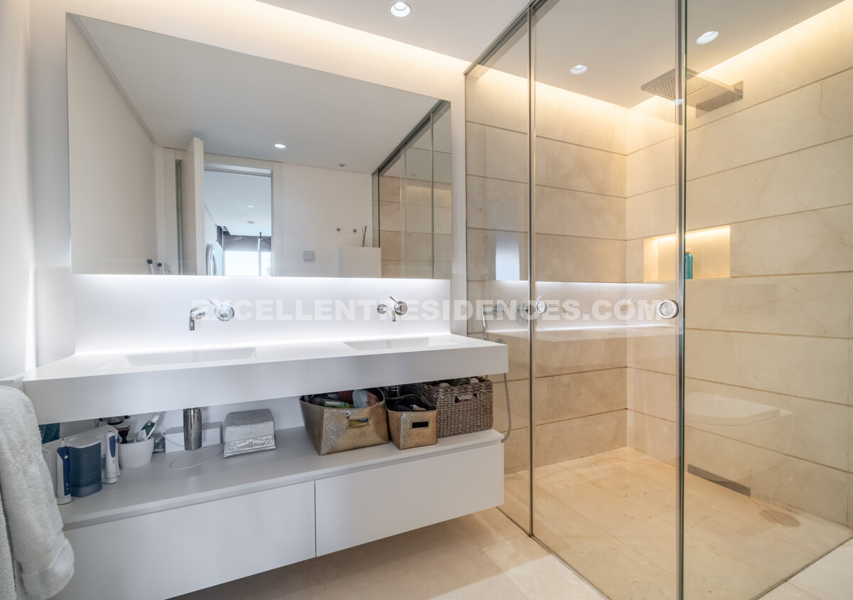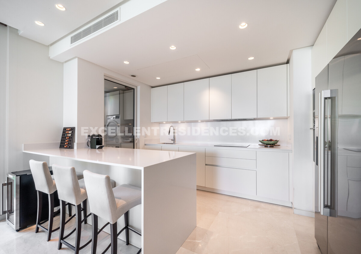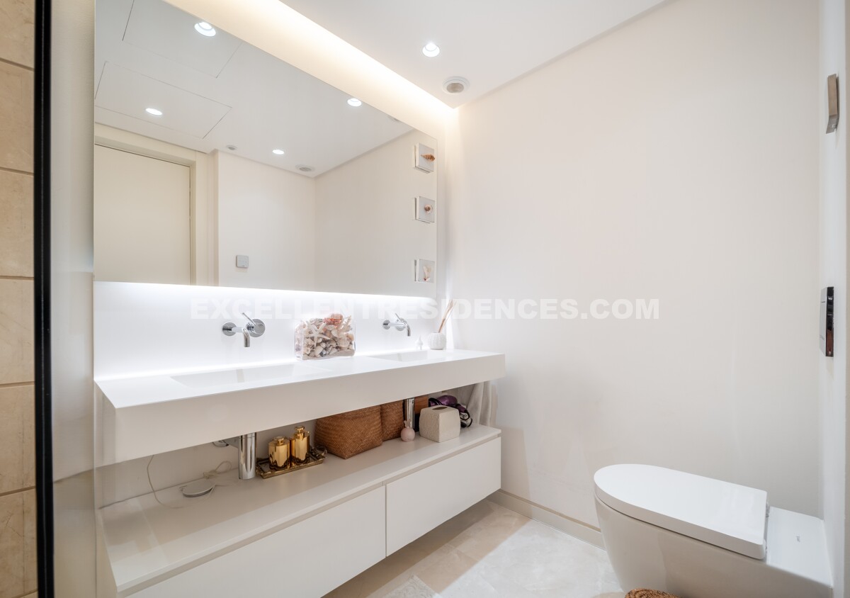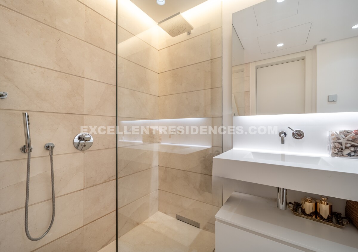 The apartment features three generously sized bedrooms. The master suite includes an en-suite bathroom with luxury finishes, a large walk-in wardrobe, and direct access to the terrace and garden. From the bed, you can enjoy uninterrupted sea and garden views. The two guest bedrooms share a full bathroom, and there is also a guest toilet for added convenience.