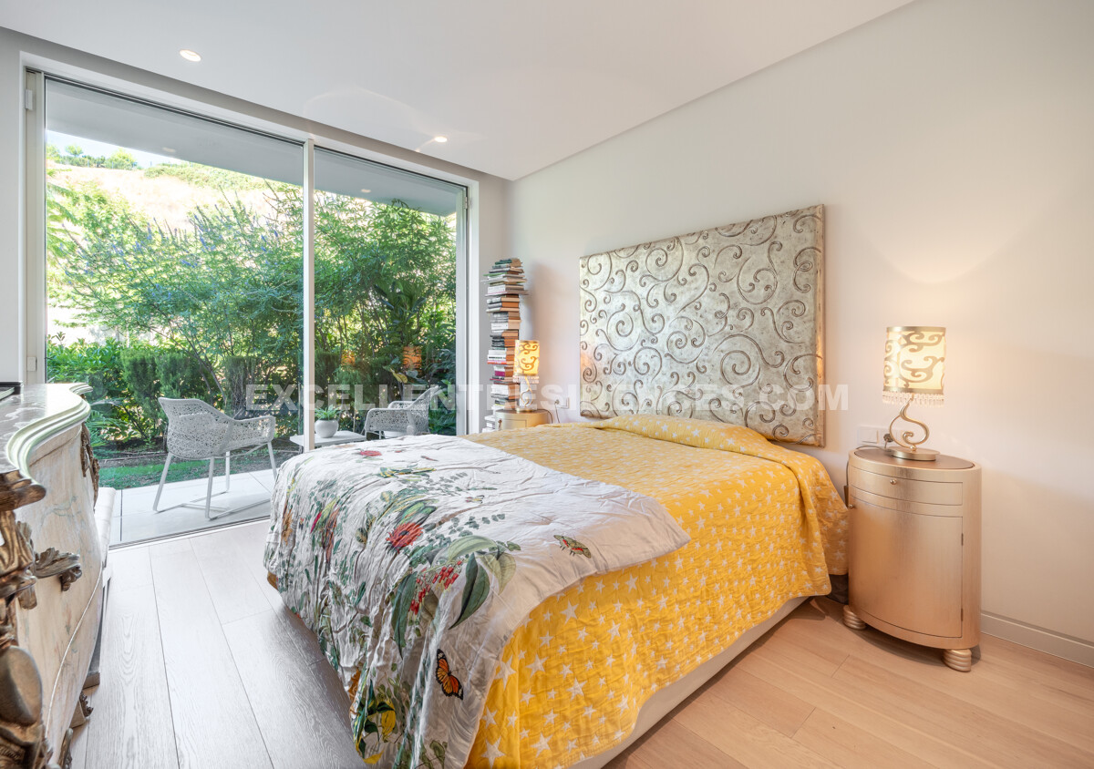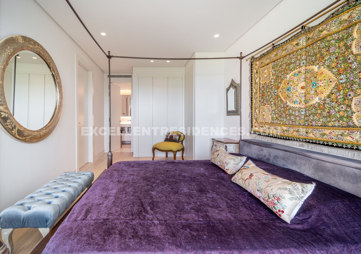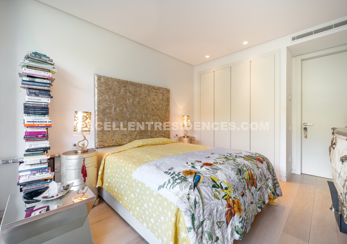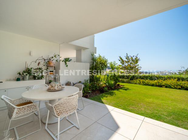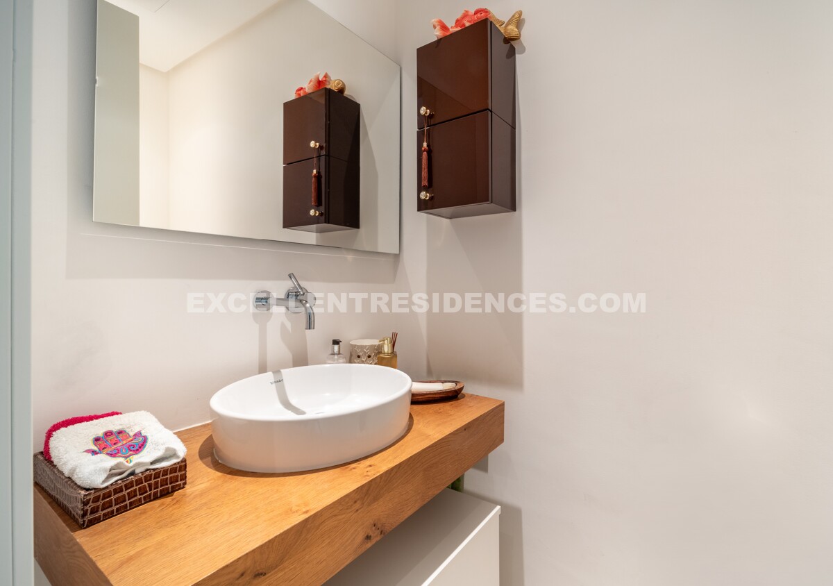 The apartment features three generously sized bedrooms. The master suite includes an en-suite bathroom with luxury finishes, a large walk-in wardrobe, and direct access to the terrace and garden. From the bed, you can enjoy uninterrupted sea and garden views. The two guest bedrooms share a full bathroom, and there is also a guest toilet for added convenience.