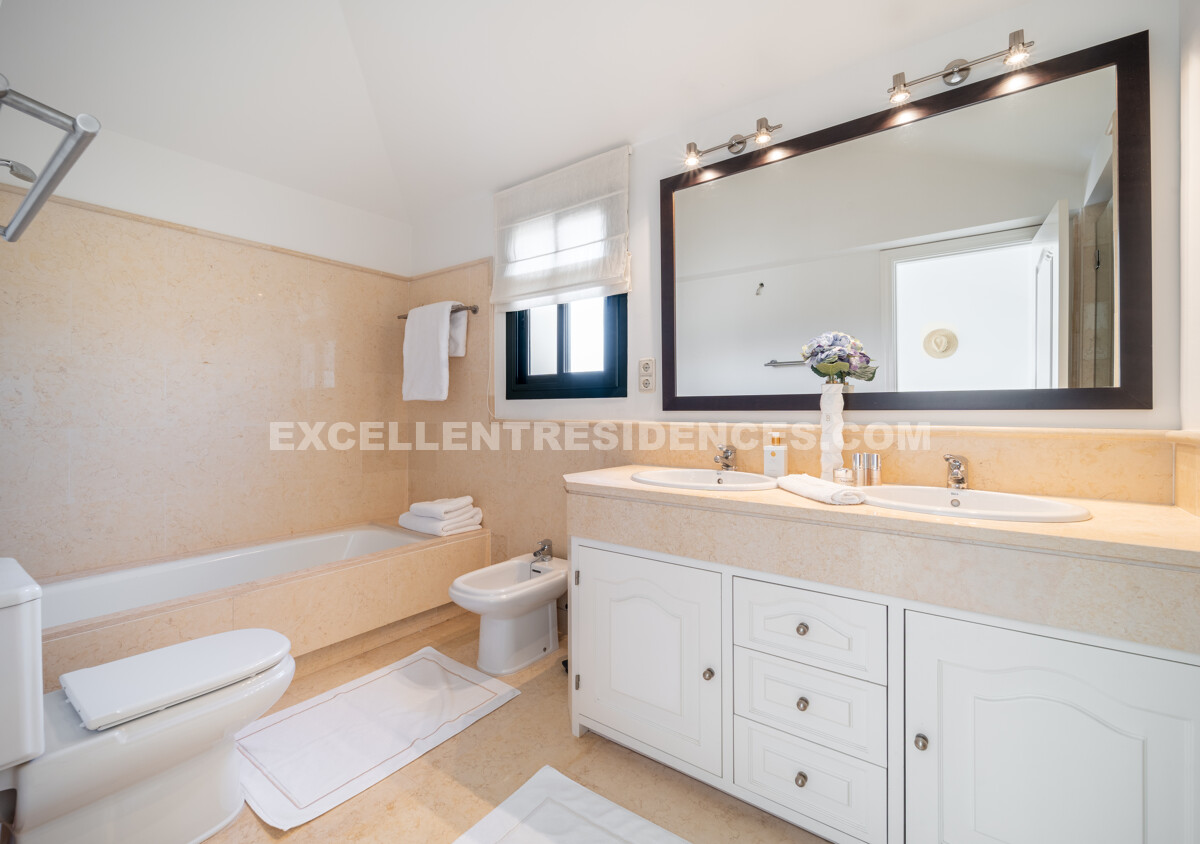 The upper floor is dedicated to the impressive master suite, which includes a large en-suite bathroom and access to a private terrace—perfect for relaxing in a peaceful, elevated setting. The layout ensures the master bedroom is completely separated from the guest quarters, offering an added level of privacy.