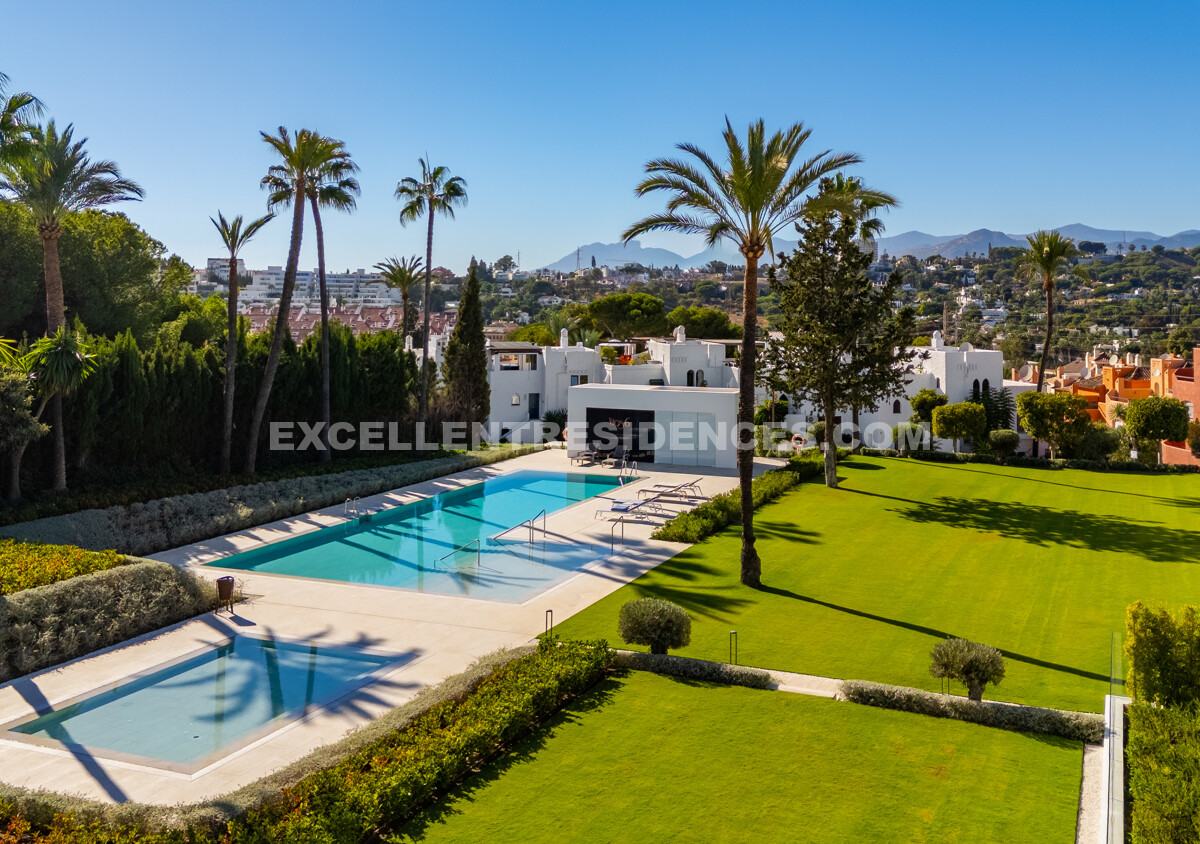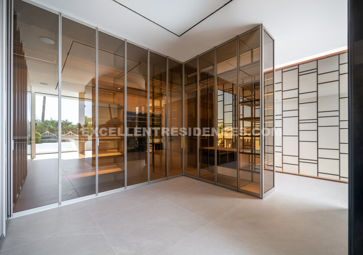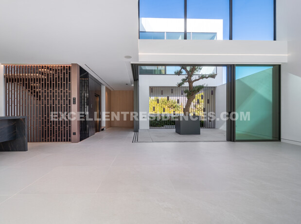 An underground garage for three cars provides direct access. The gated community offers private security, landscaped gardens, and a communal pool. Sold fully decorated and furnished by a well-known Marbella firm, this is a turnkey residence with a timeless palette of natural materials.