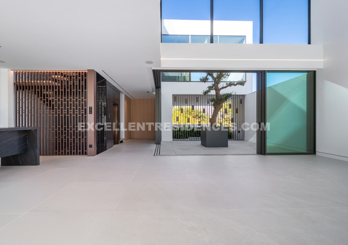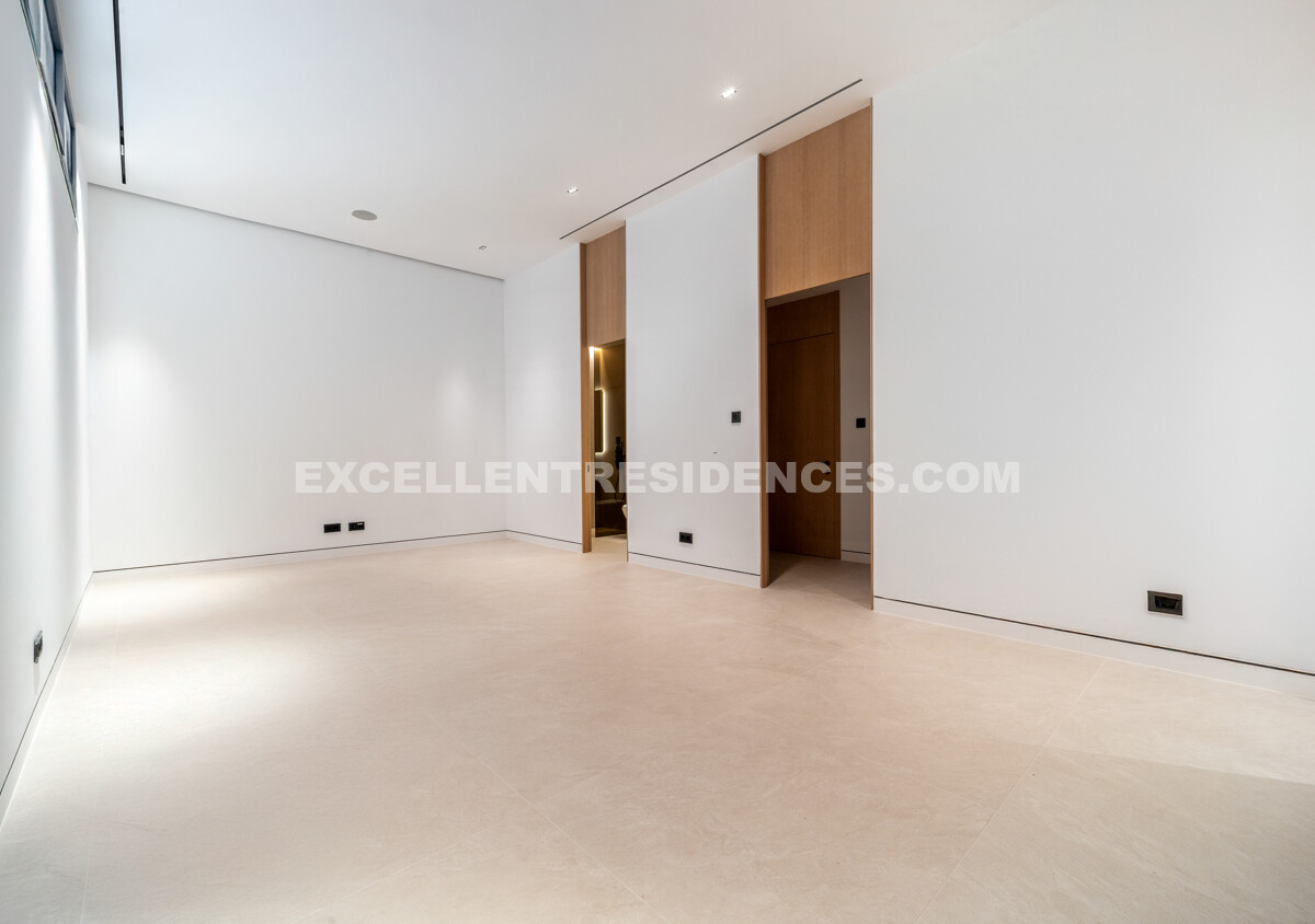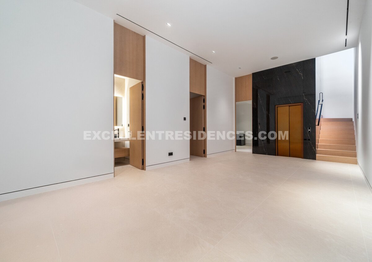 Completed in December 2023, the home is arranged across four levels, connected by an elegant staircase and a private lift, designed to enhance natural light and effortless indoor-outdoor flow. A stylish entrance with water features leads to an open-plan living and dining space framed by floor-to-ceiling glazing and opening onto expansive terraces—ideal for entertaining.