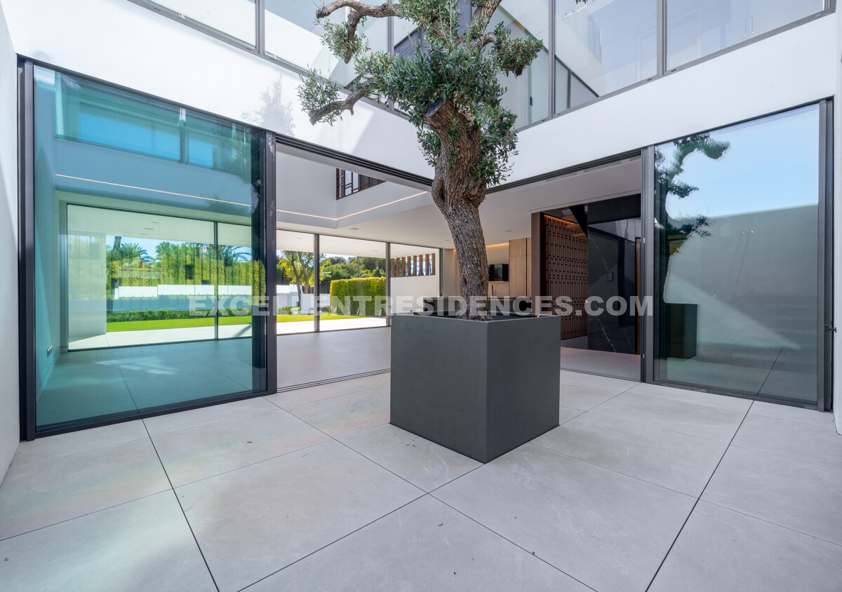 The contemporary kitchen features high-end Gaggenau appliances, complemented by a distinctive interior patio centred around a mature olive tree. Upstairs, three en-suite bedrooms present oak flooring and Porcelanosa marble detailing; the principal suite impresses with generous proportions, a walk-in wardrobe, and soothing open views.