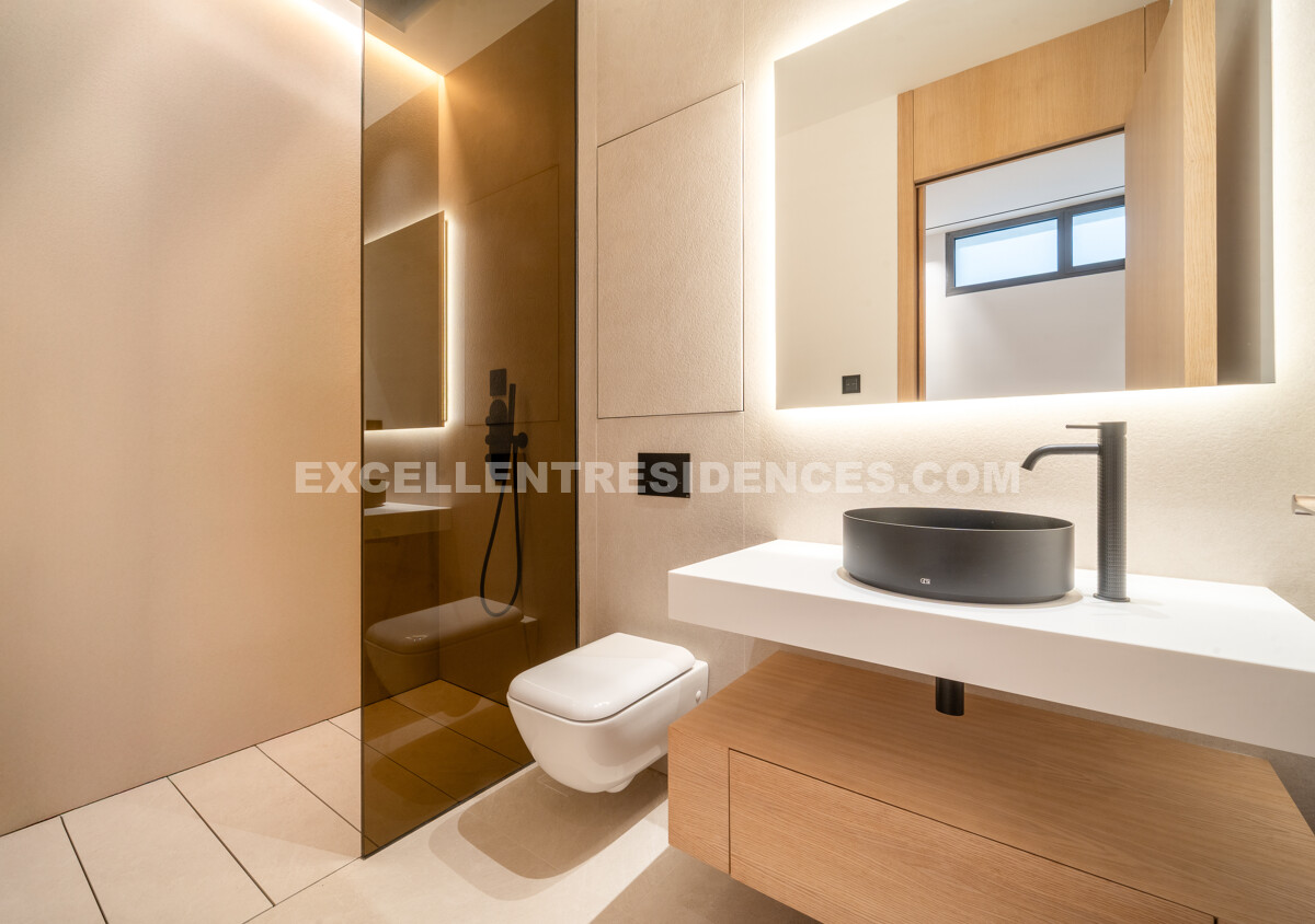 The lower level adds a fourth bedroom (ideal for guests or staff) and a private cinema for secluded entertainment. Crowning the property is an exceptional rooftop solarium with a swimming pool, outdoor kitchen, and an open-air cinema—framed by views of the Mediterranean, La Concha, and the surrounding landscape.