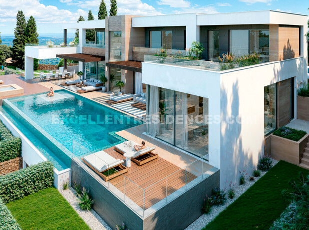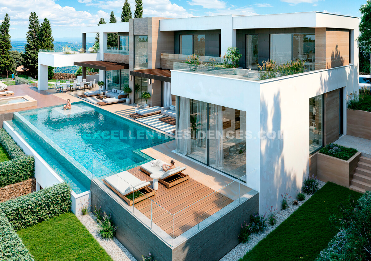The villa is arranged over several levels to enhance privacy, natural light and the surrounding scenery. Floor-to-ceiling glass doors create a seamless flow between the interior and the expansive terraces, bringing brightness and openness to every space. The main level forms the social heart of the home, with generous open-plan living and dining areas, a high-spec kitchen, and a superb principal suite with en-suite bathroom and walk-in wardrobe.