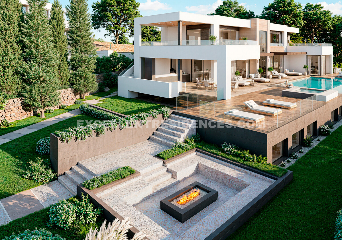 Outdoor living is central to the design, with large terraces created for both relaxing and entertaining. A covered dining area, outdoor kitchen and barbecue zone are complemented by practical guest facilities beside the pool. The landscaped gardens frame an infinity pool, jacuzzi and fire pit, creating a private atmosphere for year-round enjoyment.