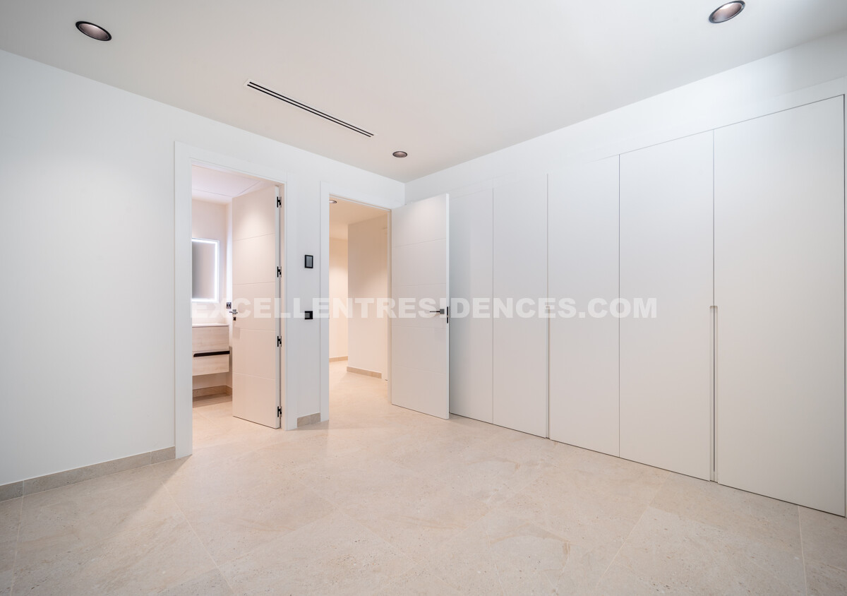 The upper level offers two spacious bedrooms with en-suite bathrooms and sea views. The master suite stands out for its size and elegance. From an intermediate level, a solarium terrace awaits, pre-fitted for a summer kitchen and jacuzzi—perfect for sunsets and al fresco gatherings.