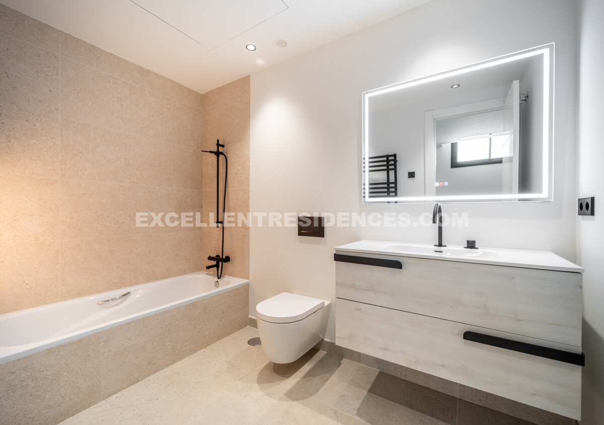 This property is equipped with underfloor heating, AirZone climate control with individual room settings, a full home automation system, LED-lit wardrobes, and pre-installation for a lift. A private parking area at the rear ensures easy access and added privacy.
