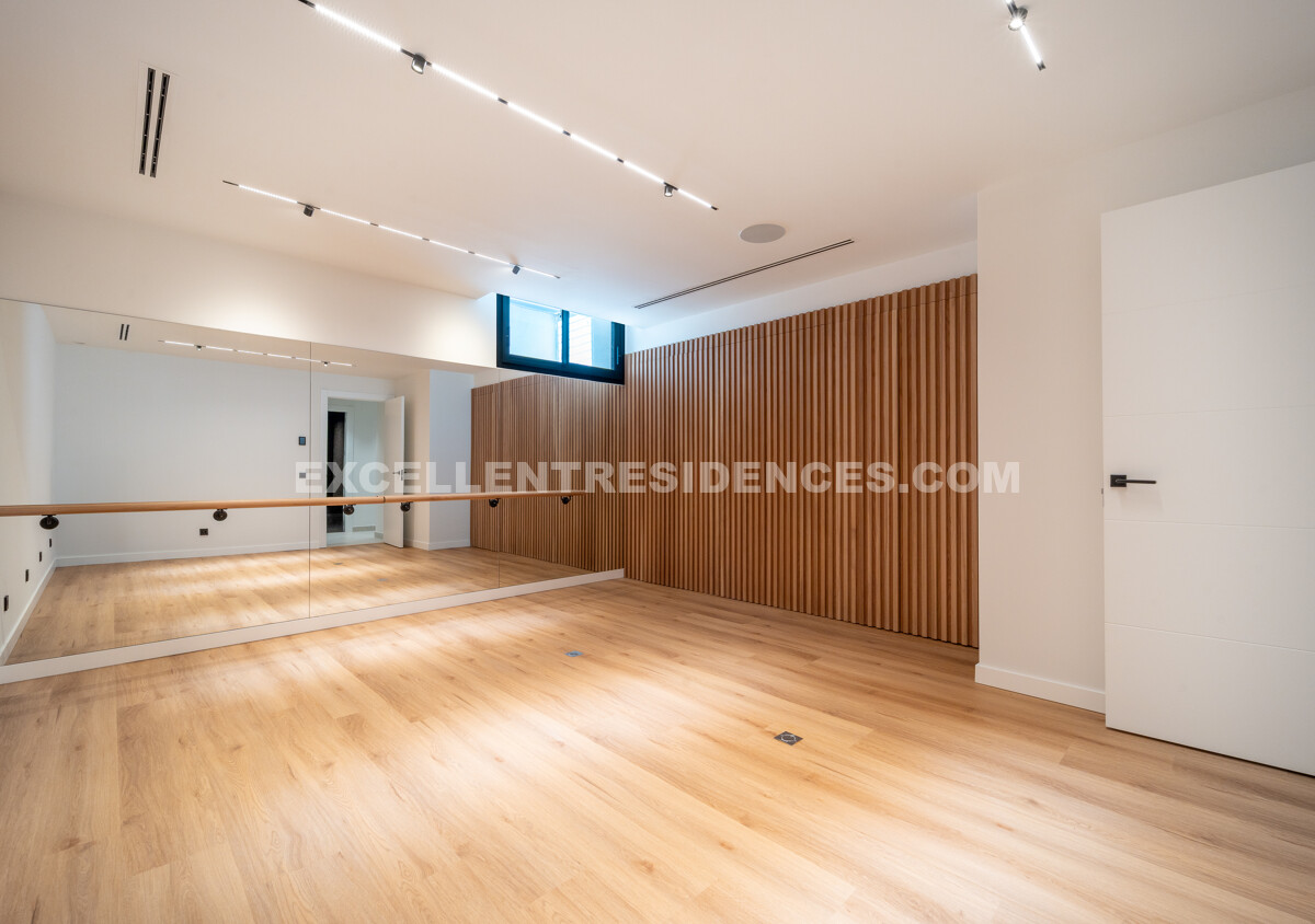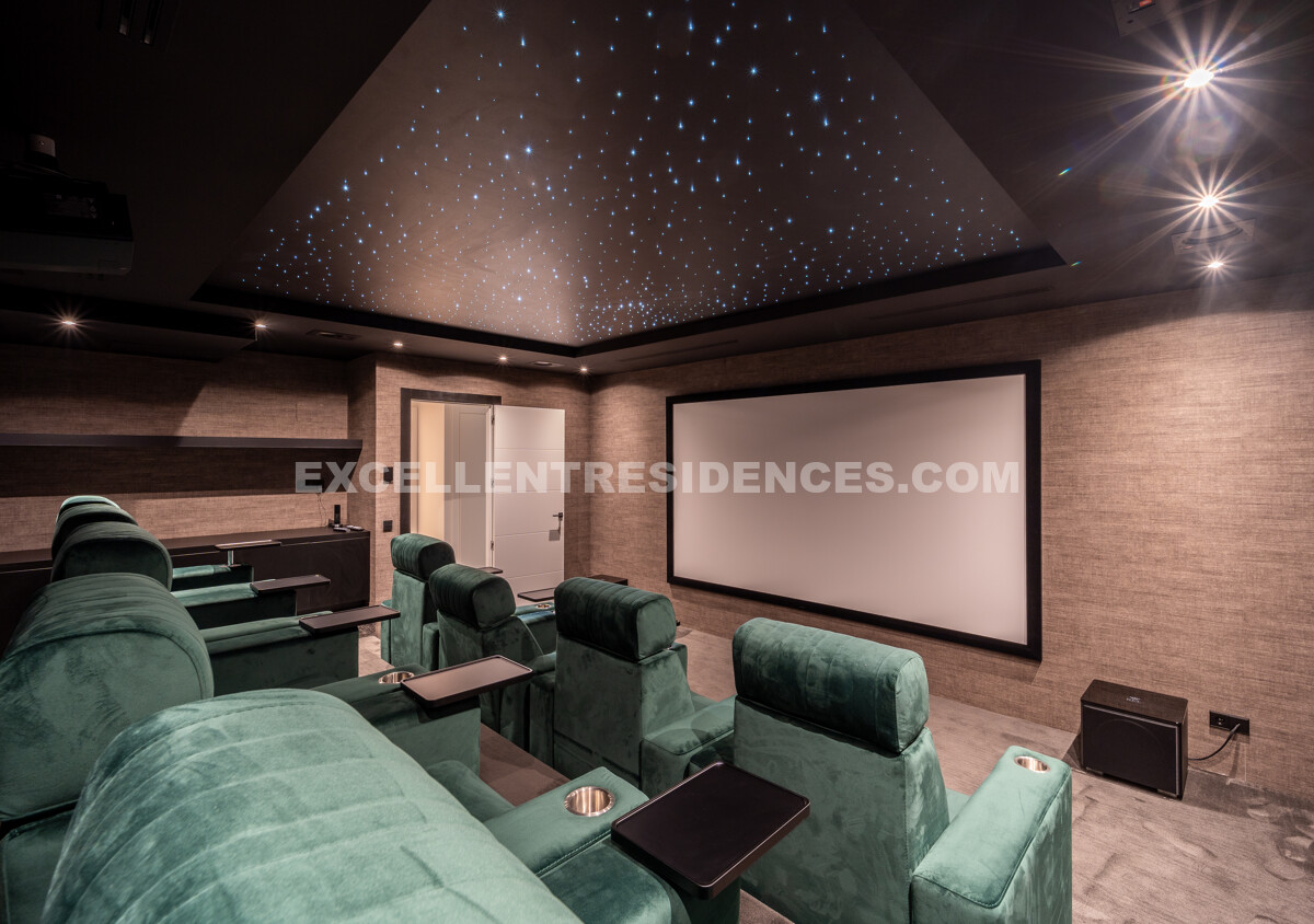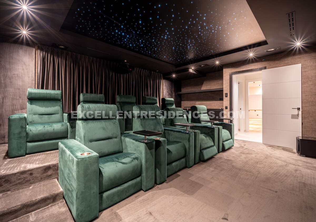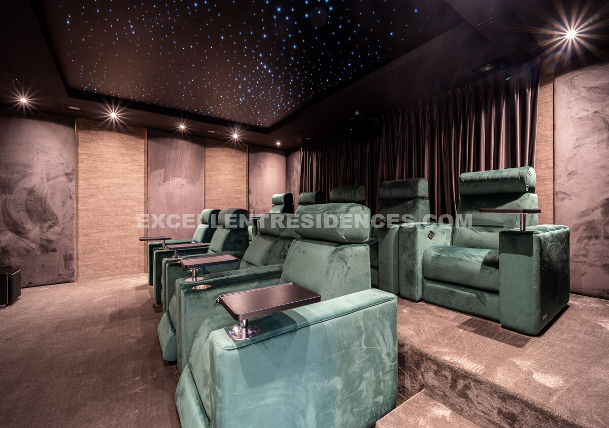 The lower level is dedicated to relaxation and entertainment, comprising a fully equipped gym, private cinema with seating for nine, a fourth bedroom ideal for guests or staff, and a laundry area.