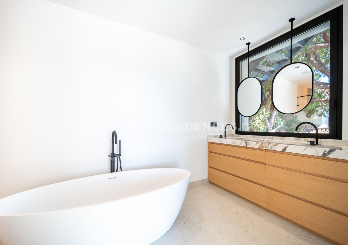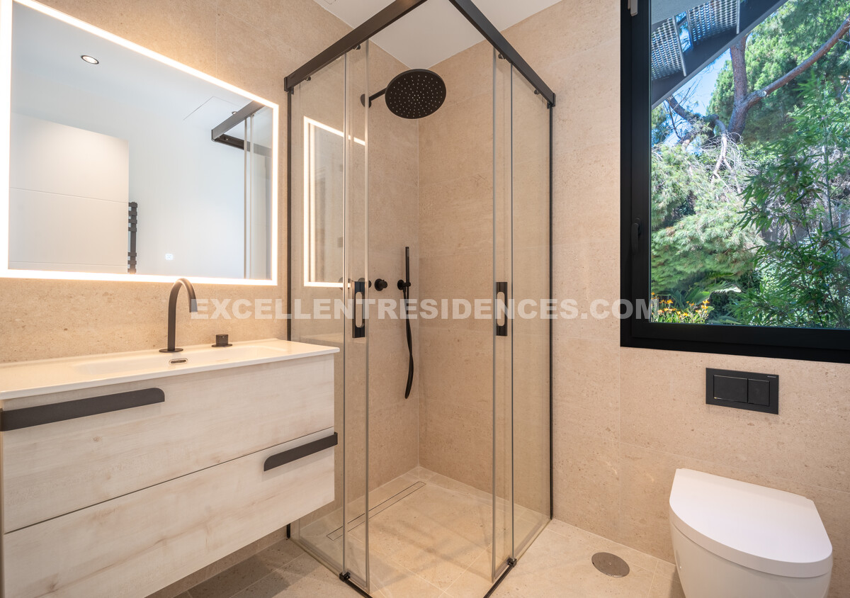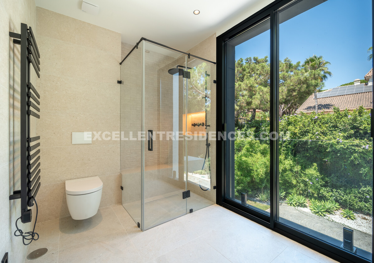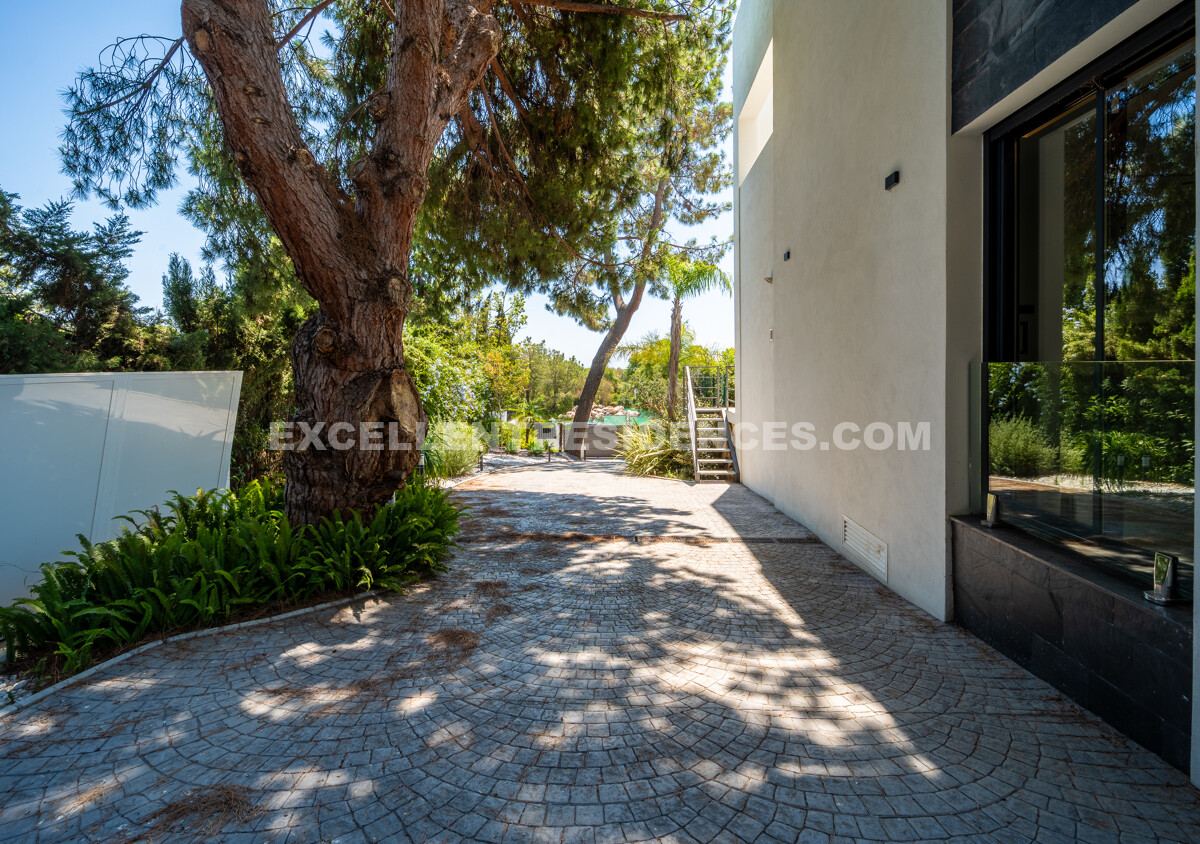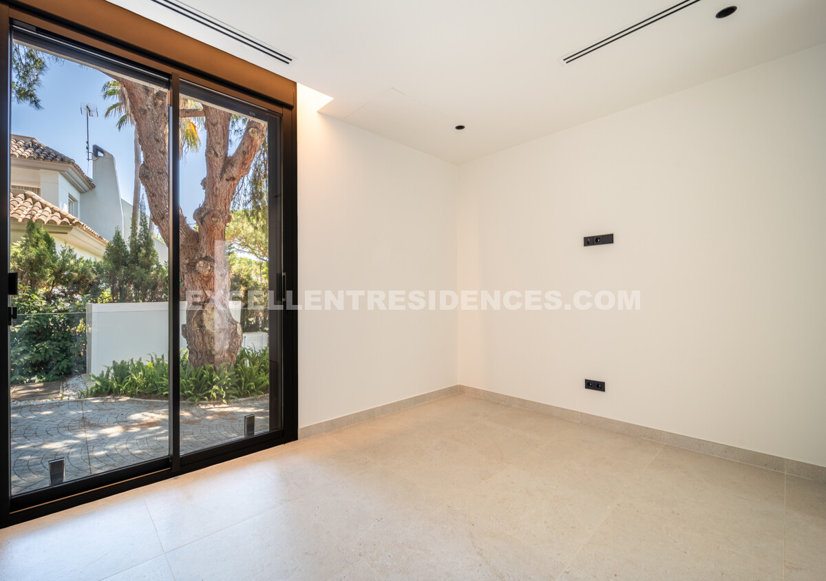 Surrounded by Mediterranean landscaping, the villa offers peace and shade while being just minutes from Marbella town and a short walk to top beaches, beach clubs, restaurants, and services. The community also includes 24-hour security and a private tennis court.