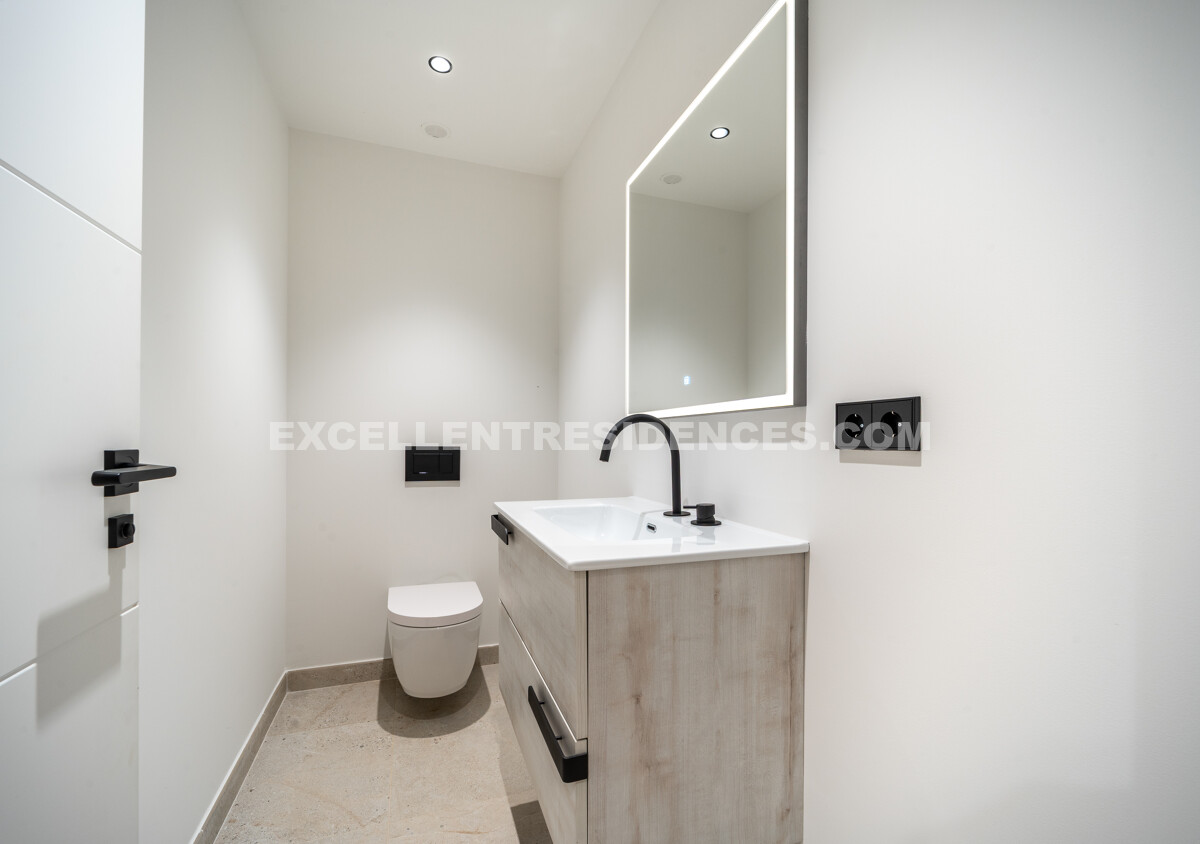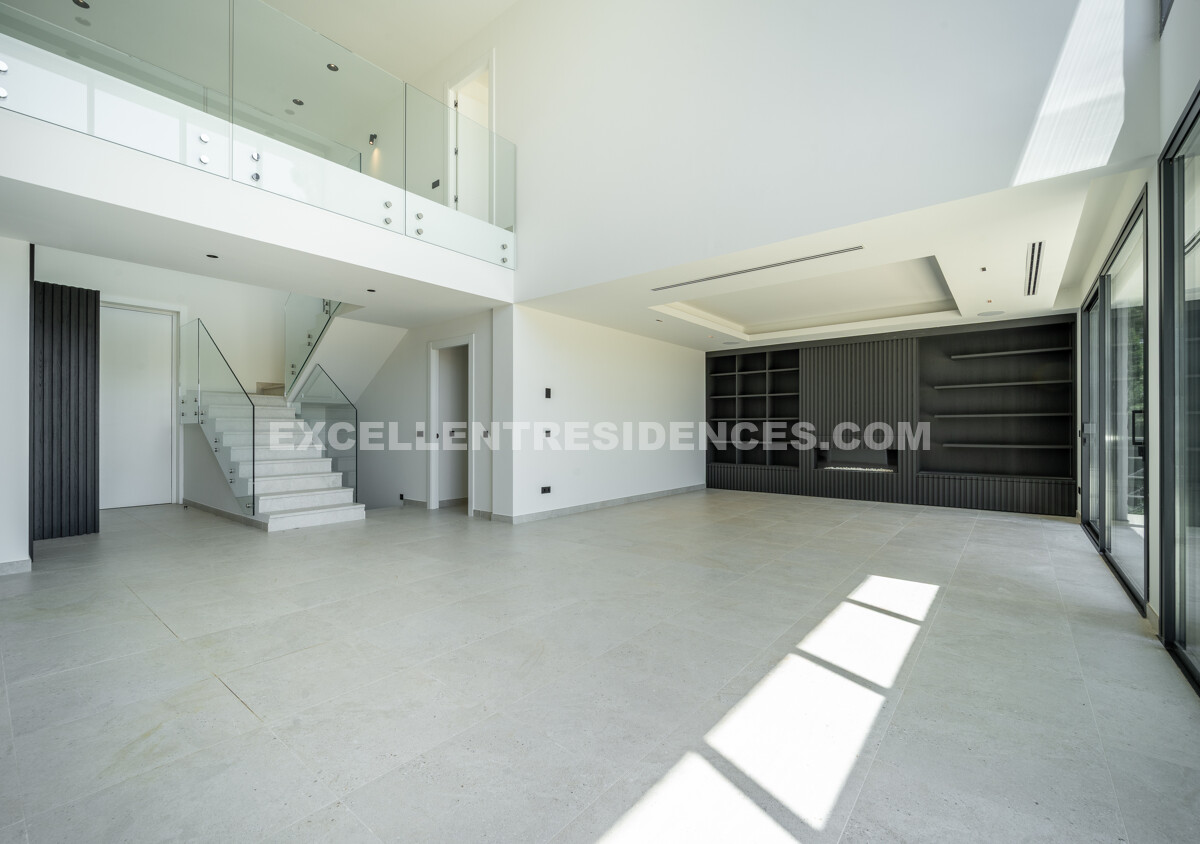 The entrance hall leads into an open-plan living and dining area with a sleek fireplace and direct access to a large terrace of over 100 m². Floor-to-ceiling windows fill the home with natural light and merge the interior with the exterior. The American-style kitchen is equipped with top-of-the-line appliances and designed for modern living. This level also includes a guest bedroom with en-suite bathroom and a guest toilet.