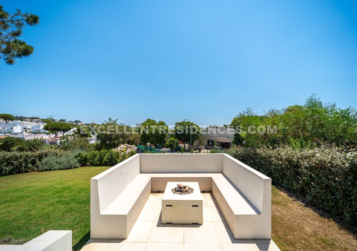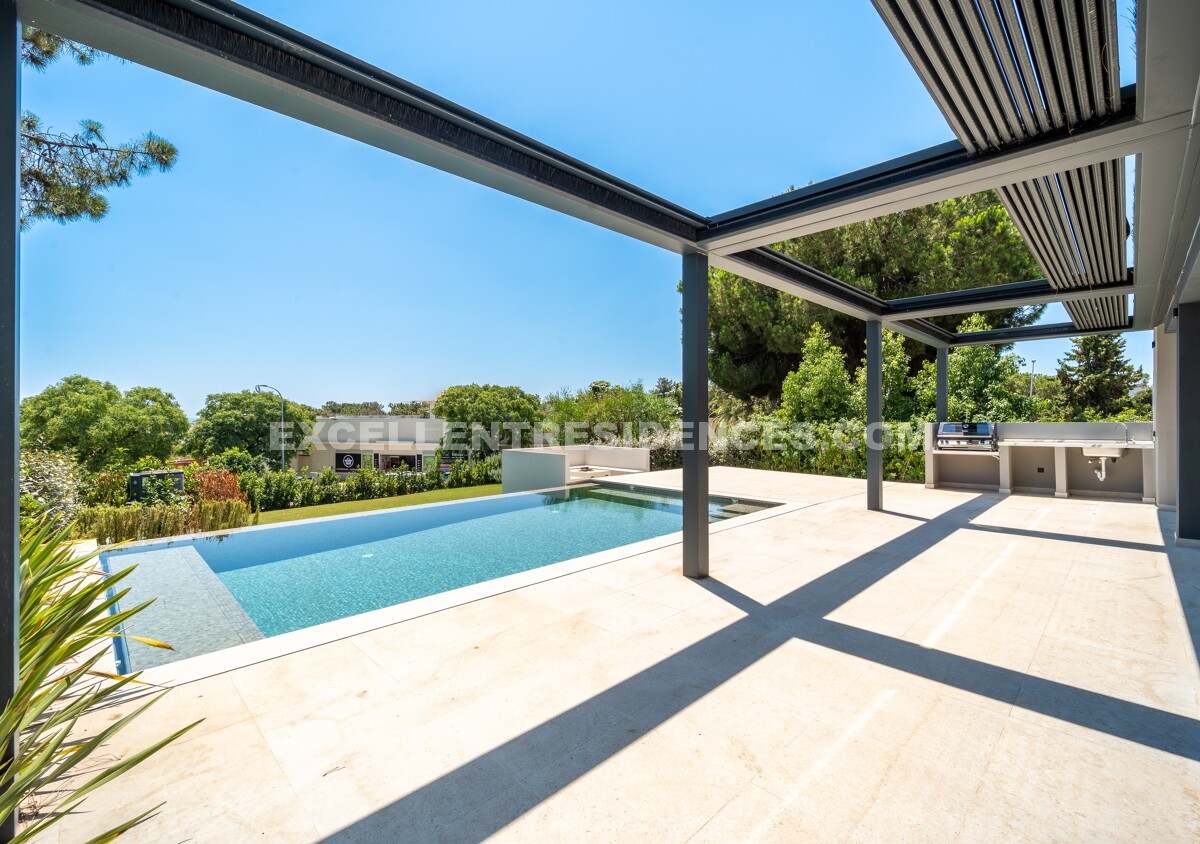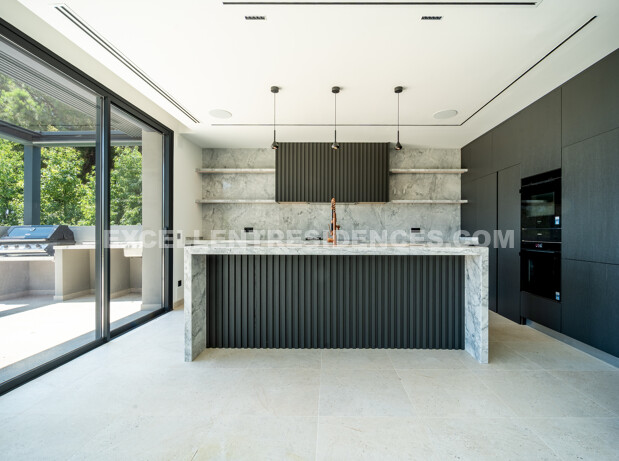 The exterior is a true extension of the living space, featuring a heated infinity pool, chill-out area with fire pit, and a complete summer kitchen under a bioclimatic pergola—ideal for year-round enjoyment.