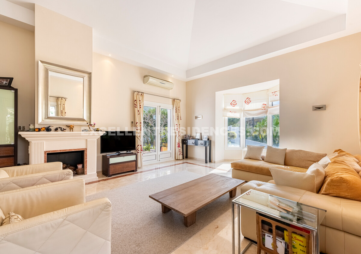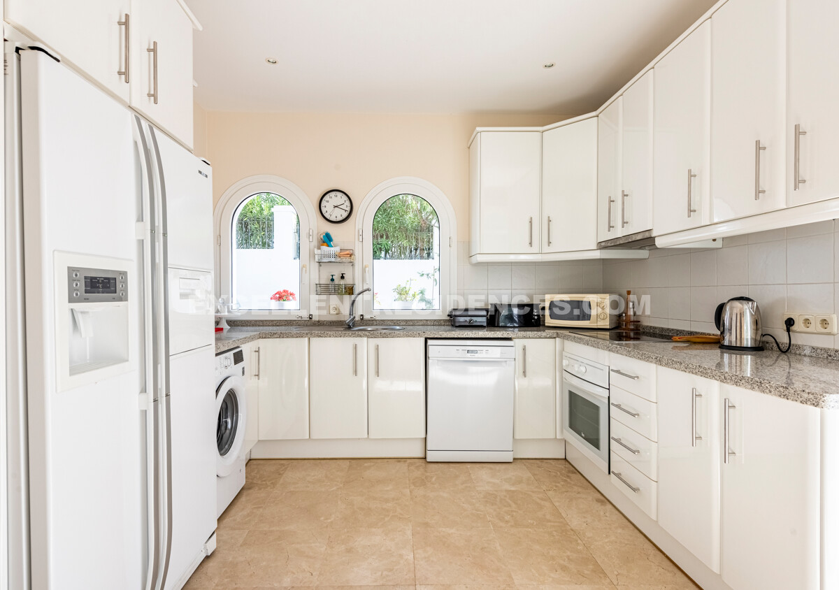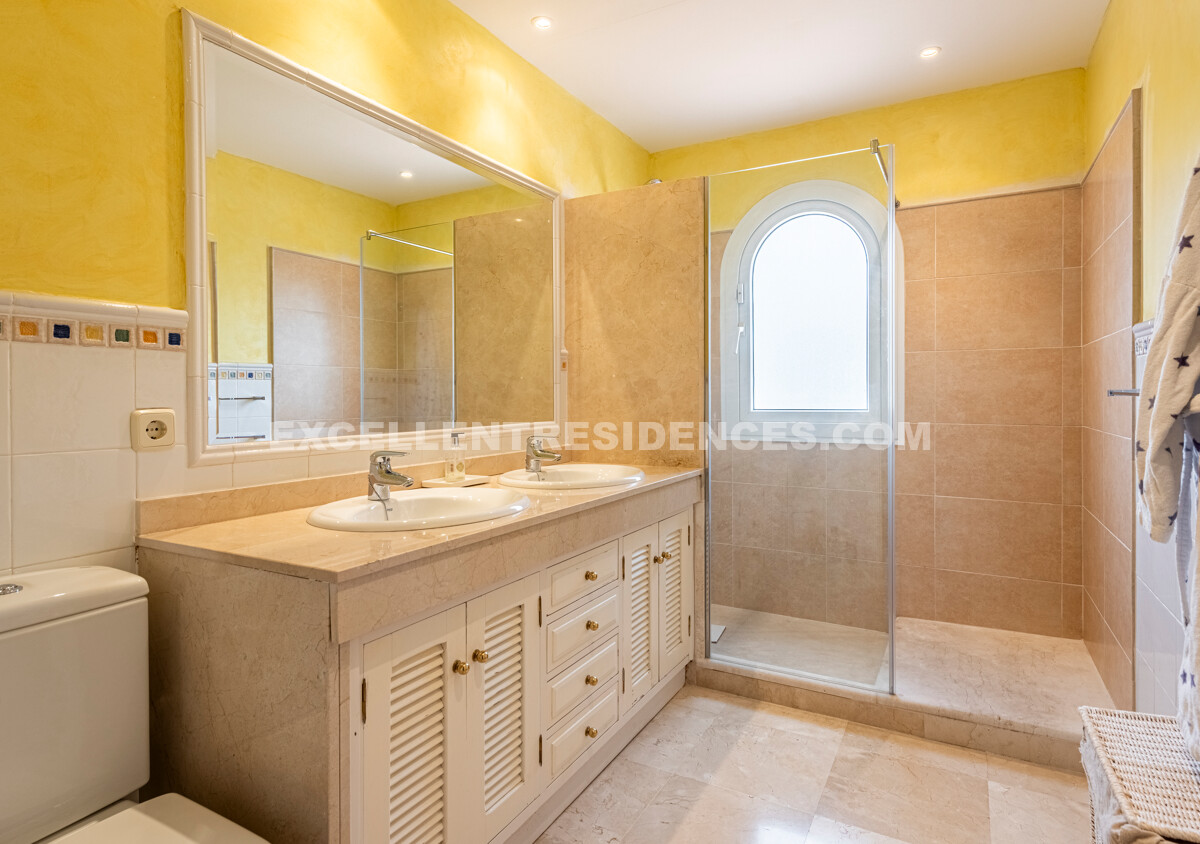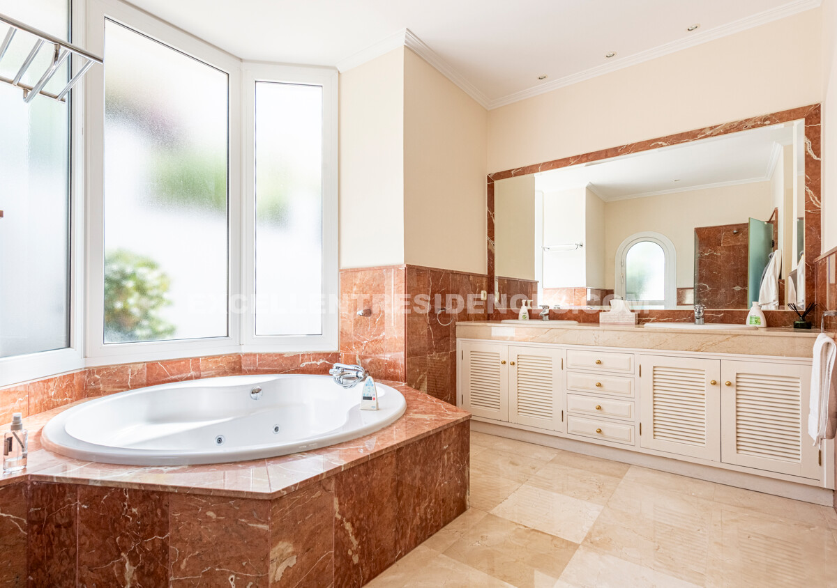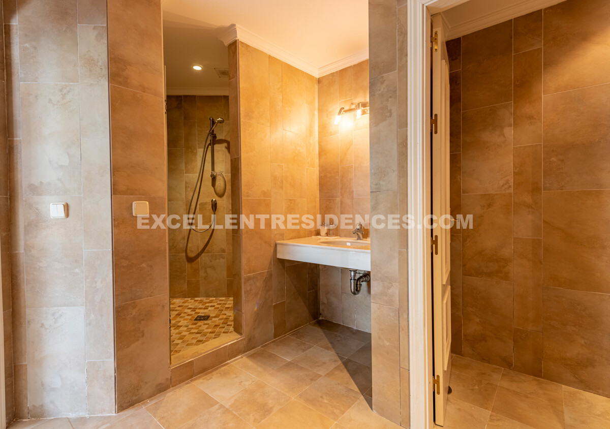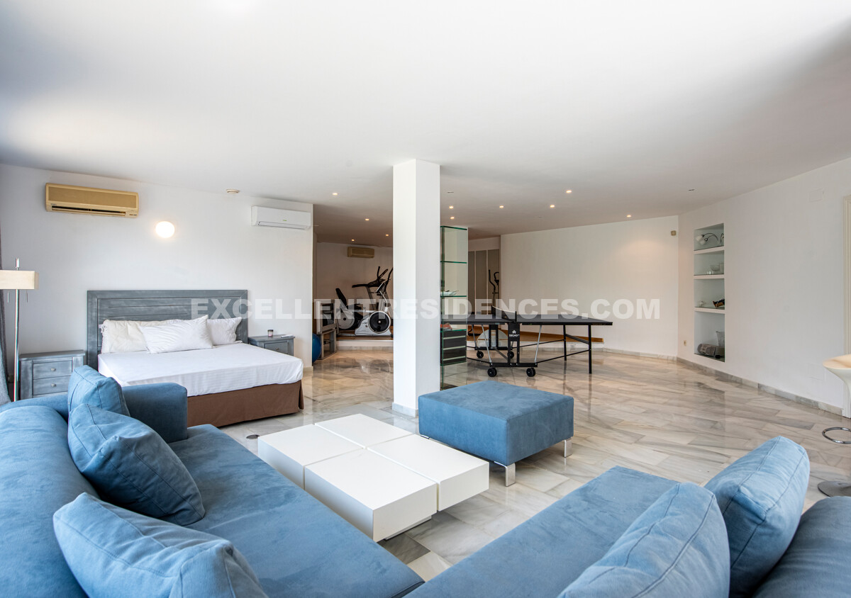 The covered rear porch runs the length of the villa, creating a superb setting for dining and relaxation with elevated views. At garden level, a self-contained guest apartment—currently a games and entertainment area—includes a fully fitted kitchen and a large bathroom. A jacuzzi and a petite private garden sit just outside, and there is scope to enlarge exterior areas by raising part of the plot to craft additional landscaped or leisure zones. An exciting canvas to modernize into a refined, contemporary retreat.