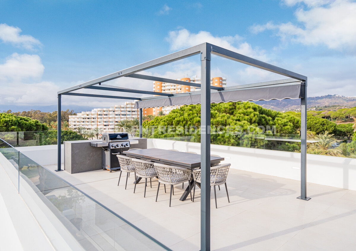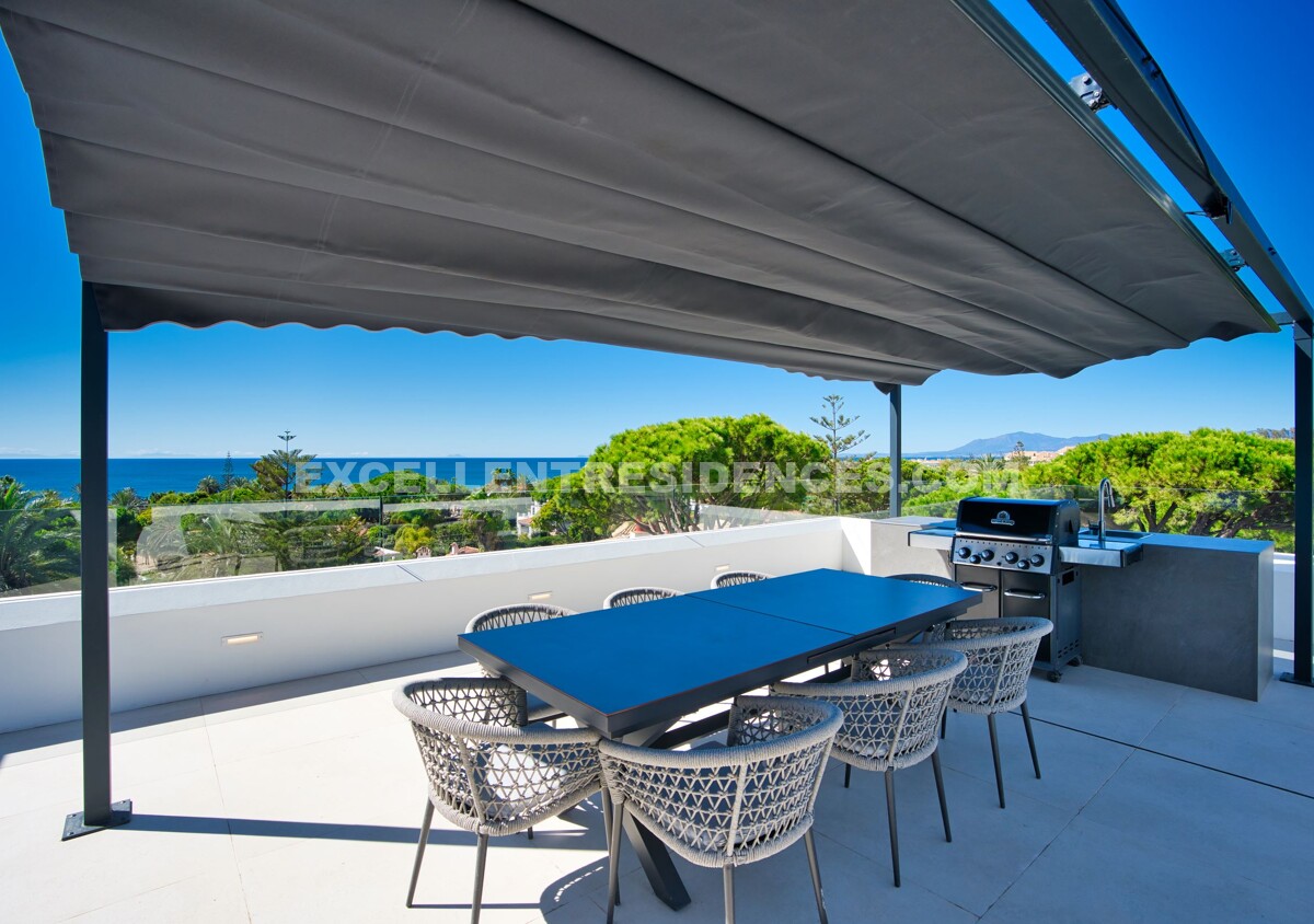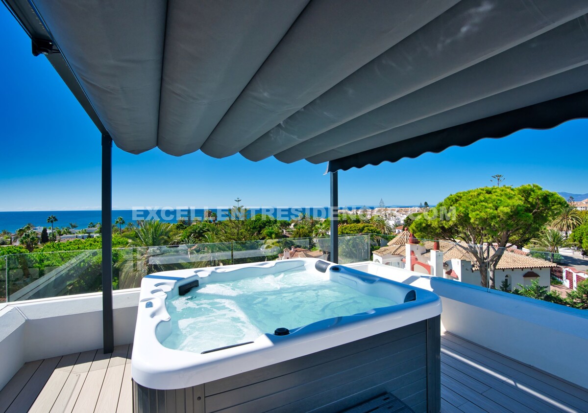 Upstairs, several bedroom suites open onto private terraces with pleasant views over the garden, surrounding greenery and towards the sea. The rooftop solarium provides panoramic coastal views and features a Jacuzzi, offering a relaxing space to enjoy the Marbella climate throughout the day.