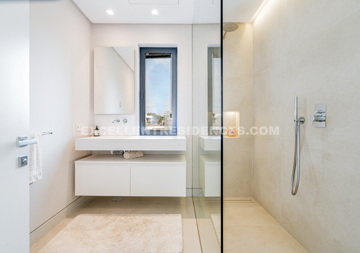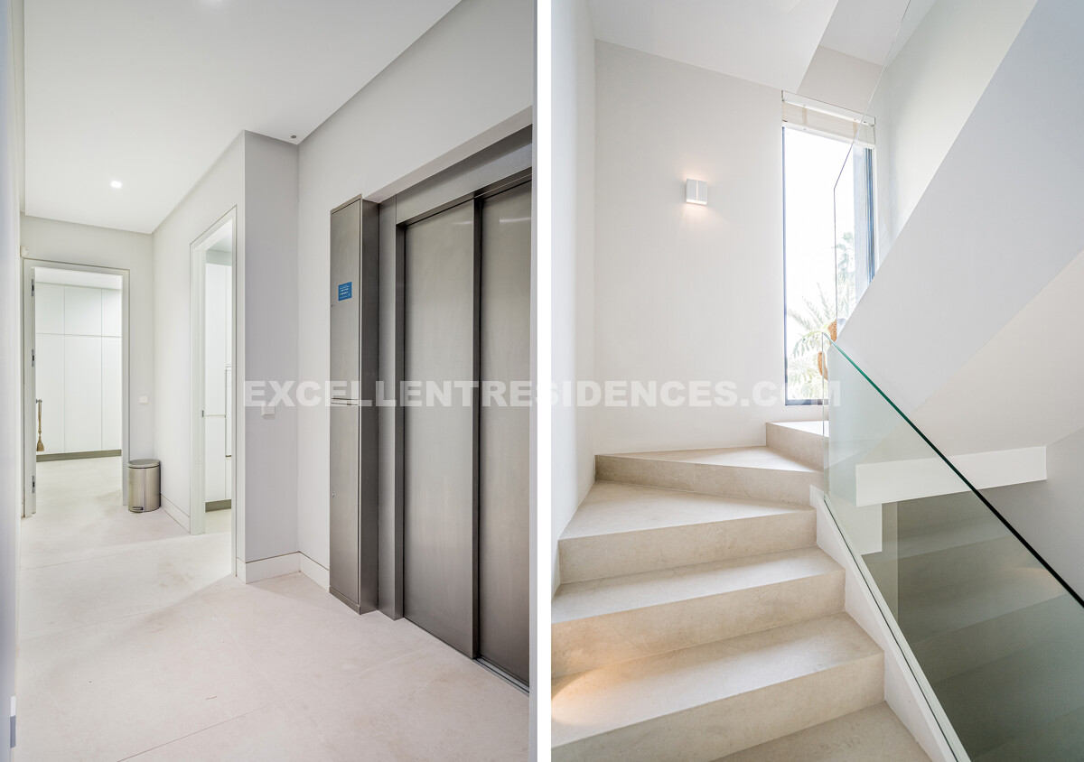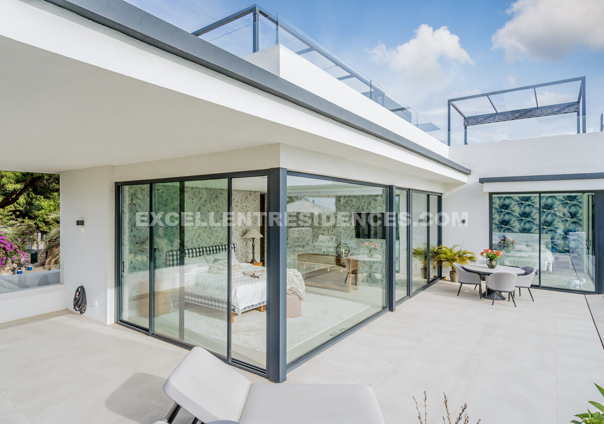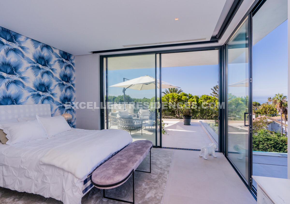 Upstairs, several bedroom suites open onto private terraces with pleasant views over the garden, surrounding greenery and towards the sea. The rooftop solarium provides panoramic coastal views and features a Jacuzzi, offering a relaxing space to enjoy the Marbella climate throughout the day.