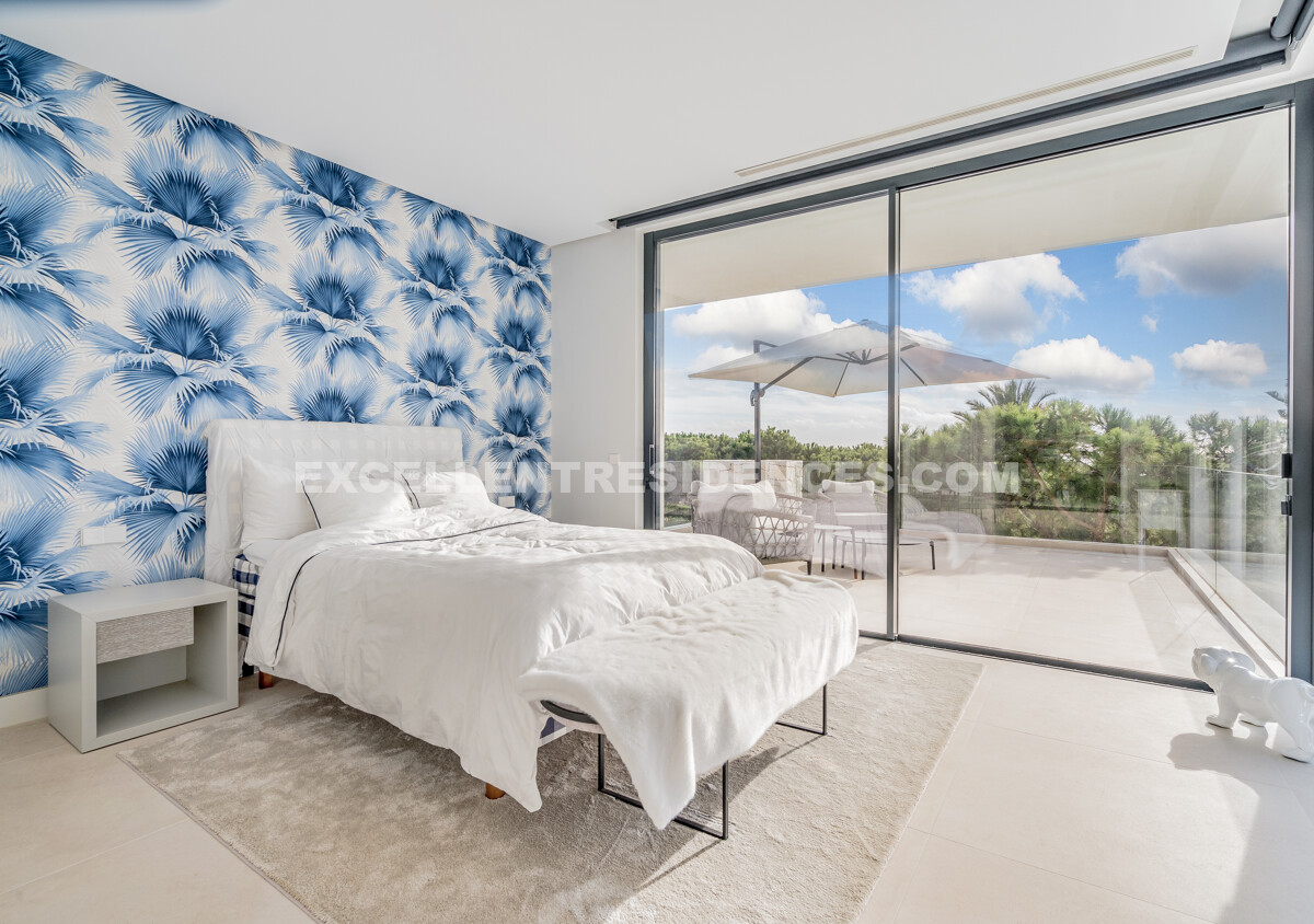 The villa is distributed over three levels, connected by both lift and staircase, and offers six en-suite bedrooms, making it ideal for families or larger groups. The main floor features a bright open-plan living and dining area with floor-to-ceiling windows opening onto the covered terrace and garden, creating a seamless connection between indoor and outdoor living. The modern kitchen with central island is both practical and stylish, and this level also includes an office, laundry room and guest toilet.